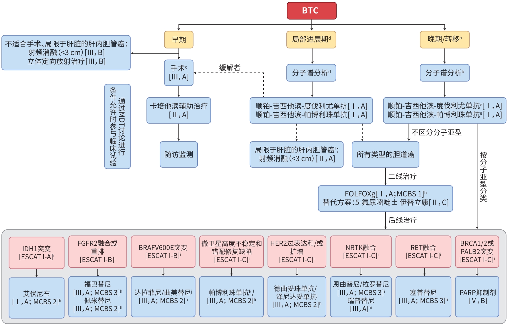 • 注: 虚线,可选治疗方案;ESCAT,ESMO分子靶点临床可操作性评分;MCBS,ESMO临床获益程度评分;MDT,多学科团队。a.在可行的情况下,建议参与临床试验。b,分子特征分析应在一线治疗前或治疗期间进行。基因检测内容应包括IDH1、FGFR2、BRAF、HER2、NTRK、RET、BRCA1/2和PALB2以检测热点突变,未来可能需要纳入更多基因(如c-MET)以适应快速发展的药物靶点和预测性生物标志物。c,特殊注意事项:(1)考虑术前引流的必要性;(2)对于可切除的远端或肝门部胆管癌,避免经皮活检;(3)评估未来残余肝功能;(4)新辅助治疗(选择性病例);(5)对意外发现的胆囊癌T1b期患者进行完成性手术。d,对于初始无法手术但对治疗有反应的患者,应考虑挽救性手术或局部治疗。e,对于体能状态较差或有明显虚弱的患者,考虑使用吉西他滨单药治疗,以避免含铂化疗方案可能带来的毒性。f,若治疗反应良好,应重新评估手术可能性。g,该方案在胆道癌中无特定获批适应证。h.使用ESMO-临床获益程度量表(MCBS) v1.1评分计算EMA或FDA批准的疗法/适应证的得分。这些得分由ESMO-MCBS工作组计算和验证,并由作者审核。i,ESMO分子靶点临床可操作性量表(ESCAT)评分仅适用于基因组驱动分析的变异。这些得分由作者定义,并由ESMO转化研究与精准医学工作组验证。j,美国食品药品监督管理局(FDA)批准,但欧洲药品管理局(EMA)未批准。k,对于未接受过一线免疫治疗的微卫星高度不稳定(MSI-H)或错配修复缺陷(dMMR)患者,推荐使用抗PD-1治疗。l,EMA批准用于MSI-H或dMMR胆道癌;FDA批准用于所有MSI-H或dMMR实体瘤。m,EMA和FDA均未批准。