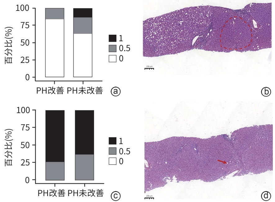 注: a,NRH半定量比较;b,NRH典型表现,红色曲线范围即为再生结节(HE染色,×100);c,ISF半定量比较;d,ISF典型表现为红色箭头所示(HE染色,×100)。