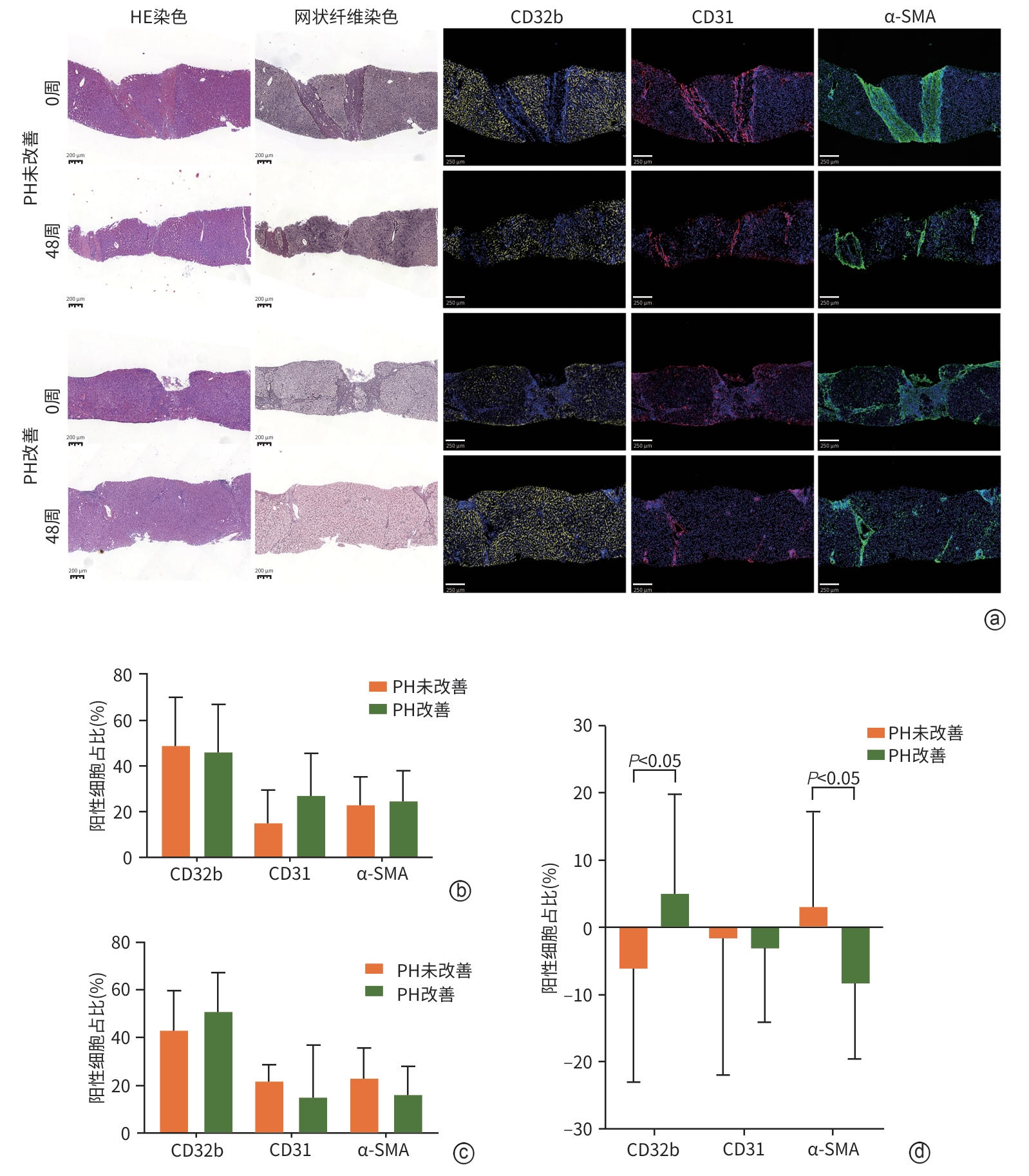 注: a,两组患者治疗前后肝组织病理染色(×100);b、c、d分别为两组患者0周、48周、48周与0周差值CD31、CD32b、α-SMA阳性细胞占比比较。