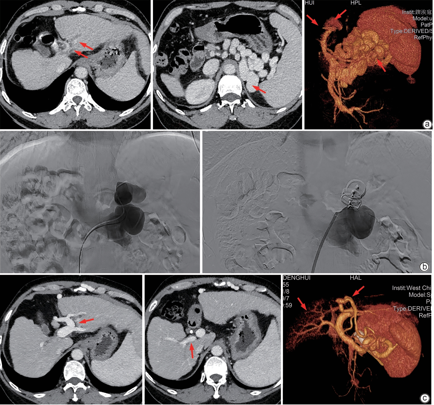 注: a,术前腹部CTA显示门静脉右支完全闭塞,左支和主干狭窄,可见较大的脾肾分流(箭头);b,血管造影提示巨大的脾肾分流道,栓塞后闭塞;c,术后5个月腹部CTA显示门静脉主干及分支完全再通(箭头),脾肾分流未再显影。