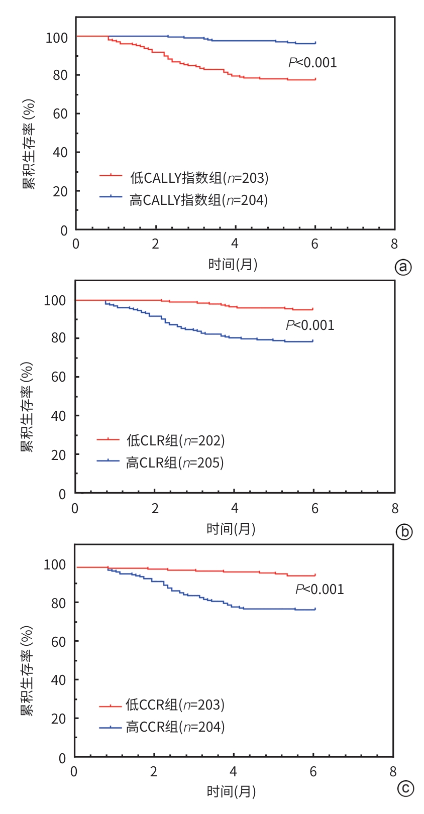 Objective To investigate the association of C-reactive protein-albumin-lymphocyte (CALLY) index, C-reactive protein-to-lymphocyte ratio (CLR), and C-reactive protein-to-serum calcium ratio (CCR) with the severity and prognosis of patients with acute pancreatitis (AP), to construct a prognosis prediction model, and to provide a reference for clinical assessment of severity and prognosis. Methods A total of 407 AP patients who were diagnosed and treated in The First Affiliated Hospital of Soochow University from June 2021 to June 2024 were enrolled as subjects, and according to the 2012 revised edition of Atlanta classification standard and the prognosis within 6 months, the patients were divided into mild disease group with 146 patients, moderate disease group with 137 patients, and severe disease group with 124 patients, as well as into poor prognosis group with 54 patients and good prognosis group with 353 patients. Clinical data were collected from all subjects, and CALLY index, CLR, and CCR values were calculated. The independent samples t-test was used for comparison of continuous data between two groups, and a one-way analysis of variance was used for comparison between three groups; the chi-square test was used for comparison of categorical data between groups. A Pearson correlation analysis was used to investigate the correlation of CALLY index, CLR, and CCR with the severity and prognosis of AP patients, and the Cox regression analysis was used to identify the influencing factors for poor prognosis of AP patients. The Kaplan-Meier survival curve was used to analyze the influence of CALLY index, CLR, and CCR on the overall survival (OS) of AP patients; R software was used to construct a nomogram model for predicting poor prognosis of AP patients based on risk factors identified by the multivariate Cox regression analysis. The receiver operating characteristic (ROC) curve was plotted to analyze the value of each independent factor used alone or in combination in predicting the poor prognosis of AP patients. Results There were significant differences between the mild, moderate, and severe disease groups in Computed Tomography Severity Index, Bedside Index for Severity in Acute Pancreatitis (BISAP) score, Acute Physiology and Chronic Health Evaluation Ⅱ(APACHE Ⅱ) score, blood urea nitrogen, serum lactic acid, serum amylase, serum lipase, CALLY index, CLR, and CCR, and there were also significant differences in these indicators between the good prognosis group and the poor prognosis group (all P<0.05). The Pearson correlation analysis showed that CALLY index was negatively correlated with the severity and prognosis of AP (rs =-0.134 and -0.280,both P<0.05), while CLR and CCR were positively correlated with the severity and prognosis of AP (rs =0.213 — 0.345,all P<0.05). The Cox regression analysis confirmed that high BISAP score(HR=2.246,95%CI:1.412 — 3.570), high APACHE Ⅱ score(HR=1.202,95%CI:1.089 — 1.327), high serum amylase level(HR=1.004,95%CI:1.001 — 1.007),high serum lipase level(HR=1.005,95%CI:1.002 — 1.008), low CALLY inde(HR=0.536,95%CI:0.397 — 0.724), high CLR(HR=1.033,95%CI:1.011 — 1.055), and high CCR (HR=1.144,95%CI:1.062 — 1.232)were independent risk factors for the poor prognosis of AP (all P<0.05). The Kaplan-Meier survival curve analysis showed that the patients with low CALLY index had a shorter median OS than those with high CALLY index (Log-rank χ2=31.934, P<0.001), and the patients with high CLR and CCR had a significantly shorter median OS than those with low CLR and CCR, respectively (Log-rank χ2=34.201 and 28.023, both P<0.001). The nomogram model constructed based on the multivariate analysis showed excellent predictive efficiency, with an area under the ROC curve (AUC) of 0.977, which was significantly better than the AUC of each indicator used alone (P<0.05), when the cut-off value is 0.107,the sensitivity and specificity of the nomogram model reached 0.963 and 0.898, respectively. Internal validation confirmed that the model had good stability, with a C-index of 0.954, and the decision curve analysis showed that it had satisfactory clinical applicability. Conclusion CALLY index, CLR, and CCR are correlated with the severity and prognosis of AP patients. High BISAP score, high APACHE II score, high serum enzyme level, low CALLY index, high CLR, and high CCR are independent risk factors for poor prognosis, and the nomogram model constructed based on multiple factors has high predictive efficiency and can achieve early accurate prediction of the prognosis of AP patients, thereby providing a practical tool for individualized intervention and dynamic risk assessment in clinical practice.