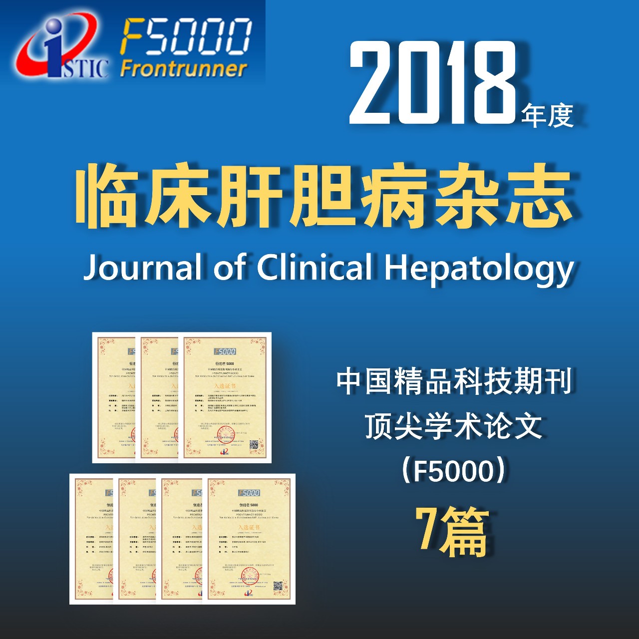 2019年11月19日,中国科学技术信息研究所召开2019年中国科技论文统计结果发布会,公布2018年度“中国精品科技期刊顶尖学术论文(F5000)”名单。《临床肝胆病杂志》共有7篇论文获此殊荣,获奖名单如下: