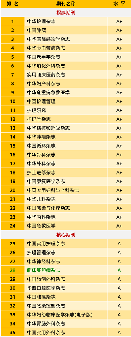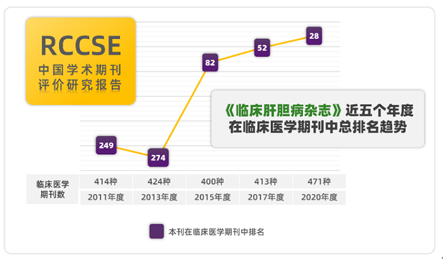 《临床肝胆病杂志》再度获评“RCCSE中国核心学术期刊(A)”,在70种临床医学核心期刊(A)中排名第4位,居消化病学类核心期刊冠首。