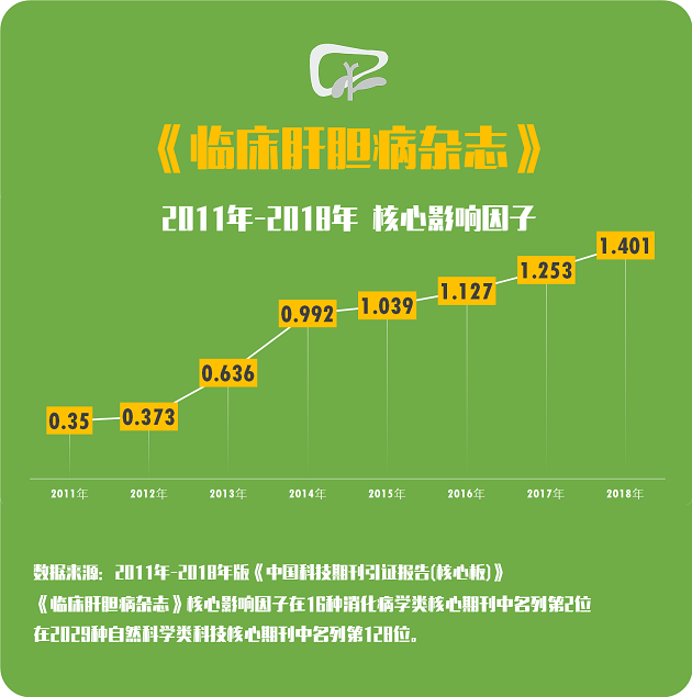 据中国科学技术信息研究所最新统计分析结果显示:《临床肝胆病杂志》在2018年《中国科技期刊引证报告(核心版)》中的影响因子为1.401,较2017年(1.253)提升了11.8%,在16种消化病学类核心期刊中排名第2位,在2029种自然科学类科技核心期刊中排名第128位。