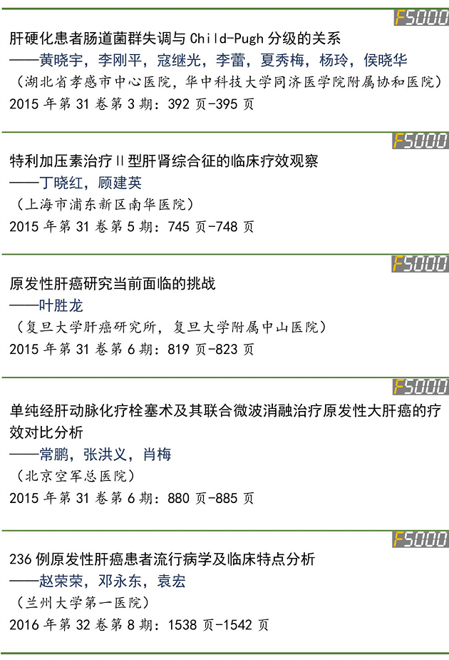 近期,中国科学技术信息研究所在第4届“中国精品科技期刊”的基础上,通过定量定性分析遴选出2018年度“中国精品科技期刊顶尖学术论文(F5000)”,《临床肝胆病杂志》共有5篇论文入选,入选名单如下: