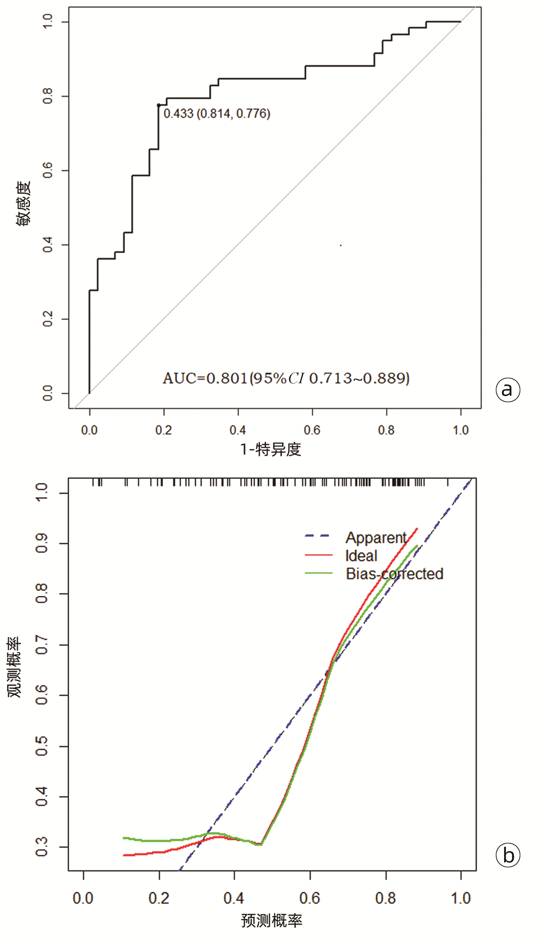 目的 本研究旨在寻找乙型肝炎肝硬化CT特征,建立肝硬化上消化道出血预测模型,预测出血风险。 方法 回顾性分析2015年1月—2021年6月天津市第一中心医院101例型肝炎肝硬化患者的数据,将其分为上消化道出血组(P=58)及非出血组(n=43)。比较两组间实验室检查以及强化CT检查测的平扫期、动脉期、门脉期以及静脉期的CT值,并计算各期间CT值的变化(ΔCT)。计量资料两组间的比较使用t检验或Mann-Whitney U检验;使用logistic回归分析方法,预测相关危险因素;通过计算受试者工作特征曲线下的面积评估模型辨别力,而模型校准则通过Hosmer-Lemeshow确定。在多变量logistic回归分析结果的基础上,使用Rstudio4.1.2软件的R包构建预测的列线图模型,并绘制相应的ROC曲线、校准曲线以及临床决策曲线。 结果 非出血组血清TBil、WBC、PLT水平与出血组比较,差异均有统计学意义(P值均<0.05);两组在肝-Plain、脾-P-Plain、脾-P-A ΔCT值存在统计学差异(P值均<0.05)。单因素logistic分析结果显示,白细胞(OR=0.770,95%CI:0.624~0952, P=0.016)、血小板(OR=0.979,95%CI:0.965~0.994, P=0.006)、肝脏平扫期(OR=1.142,95%CI:1.058~1.233, P=0.001)、脾脏门脉期-平扫ΔCT值(OR=0.979,95%CI:0.959~1.000, P=0.050)、脾脏门脉期-动脉期ΔCT值(OR=0.979,95%CI:0.944~0.994, P=0.015)在乙型肝炎肝硬化患者发生上消化道出血与未出血两者之间差异具有统计学意义。多因素logistic分析结果显示血小板(OR=0.968,95%CI:0.944~0.993, P=0.011)、肝脏平扫期(OR=1.148,95%CI:1.047~1.259, P=0.003)、脾脏门脉期-动脉期ΔCT值(OR=0.951,95%CI:0.908~0.995, P=0.030)为上消化道出血的独立危险因素。基于多因素logistic分析结果,构建了乙型肝炎肝硬化上消化道出血的预测模型并绘制校准曲线。该模型的受试者特征曲线下面积为0.801,cut-off值为0.433,其对应的敏感度是81.4%,特异度是77.6%。模型的校准曲线与理想曲线贴合良好。 结论 乙型肝炎肝硬化肝脏具有特殊的ΔCT变化,通过ΔCT构建的预测模型对于乙型肝炎肝硬化上消化道出血具有良好的预测能力。