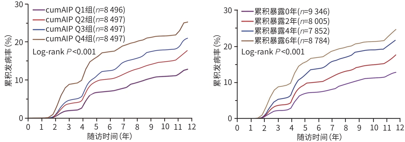 目的  探讨累积血浆致动脉硬化指数(cumAIP)与年龄<60岁人群新发非酒精性脂肪性肝病(NAFLD)风险的关联。  方法  采用前瞻性队列研究方法,选取2006年6月—2010年10月在开滦总医院及其下属10家医院完成健康体检的开滦研究队列中青年人群(年龄18~<60岁)为研究对象,根据纳入与排除标准筛选后,33 987例进入观察队列。根据计算的cumAIP值四分位数分为4组(Q1、Q2、Q3、Q4组),用Kaplan-Meier法计算4组NAFLD的累积发病率,并使用Log-rank检验比较组间差异;采用多因素Cox回归分析获得4组中新发NAFLD风险的风险比(HR)和95%可信区间(CI)。正态分布的计量资料多组间比较采用单因素方差分析,非正态分布的计量资料多组间比较采用Kruskal-Wallis H检验;分类变量组间比较采用χ2检验。  结果  平均随访(10.89±2.54)年,共新发NAFLD 6 011例,cumAIP Q1~Q4组分别发生995例、1 366例、1 661例和1 989例,发病密度依次为11.37/1 000人年、16.02/1 000人年、19.97/1 000人年和24.91/1 000人年。Log-rank检验显示,各分组之间累积发病率差异有统计学意义(P<0.001)。以是否发生NAFLD为因变量,不同cumAIP暴露水平四分位数分组为自变量,以cumAIP Q1组为参照,多因素Cox回归模型显示:Q2、Q3、Q4组新发NAFLD的HR及95%CI分别为1.30(1.20~1.41)、1.52(1.41~1.65)和1.79(1.64~1.95),P趋势<0.001。以是否新发NAFLD为因变量,AIP累积暴露0、2、4和6年为自变量,以AIP累积暴露0年为参照,Cox回归分析显示:AIP累计暴露2、4、6年的HR及95%CI分别为1.24(1.15~1.35)、1.51(1.40~1.64)和1.70(1.56~1.84),P趋势<0.001。在排除2年内新发NAFLD,随访期间发生ASCVD事件患者,服用降压药、降糖药、降脂药的研究对象后,分别进行敏感性分析,结果与主要分析结果相似;考虑到全因死亡与结局事件存在竞争关系,进行死亡竞争风险分析,结果显示,风险分析结果与主要分析结果相似。  结论  cumAIP高水平暴露增加中青年人群新发NAFLD风险。
