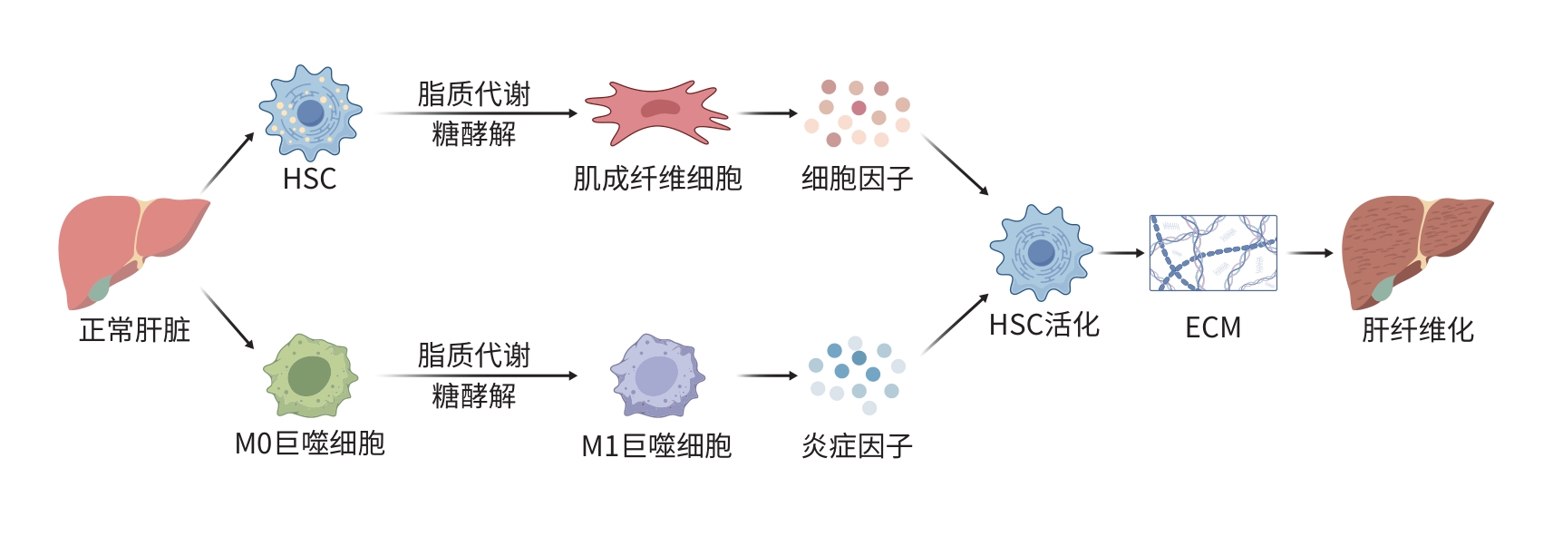 肝纤维化的发生过程复杂,随着对其研究的深入,越来越多的证据表明,在肝纤维化的发生发展过程中存在大量的代谢重编程。本文主要对肝巨噬细胞的来源及相关作用、肝星状细胞的分布以及二者在肝纤维化发生过程中的糖酵解和脂质代谢变化进行综述,以期为肝纤维化的研究和防治提供新的见解。