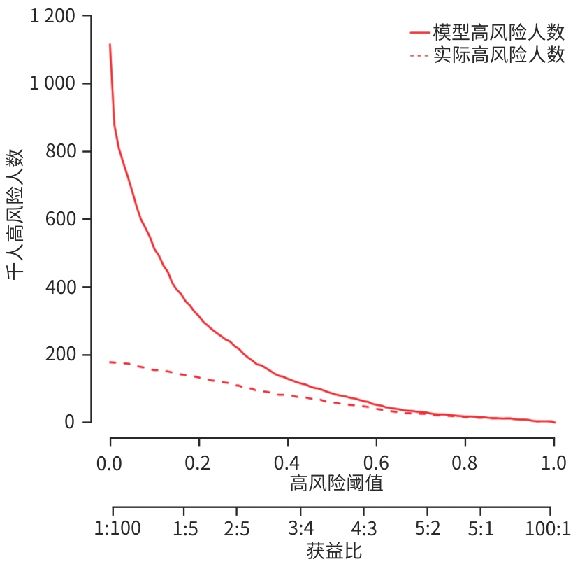 目的 分析失代偿期乙型/丙型肝炎相关肝硬化患者合并门静脉血栓(PVT)的独立影响因素,建立列线图风险预测模型并进行验证。 方法 回顾性收集2022年1月—2023年12月首次在昆明市第三人民医院就诊的1 116例失代偿期乙型/丙型肝炎肝硬化患者的临床资料,并按是否合并PVT分为PVT组和对照组。计量资料两组间比较采用成组t检验或Mann-Whitney U检验。计数资料两组间比较采用χ2检验。用单因素分析、最小绝对收缩和选择算子(Lasso)回归筛选变量,多因素二元Logistics回归分析筛选独立影响因素并建立预测模型,列线图可视化模型;并使用受试者操作特征曲线(ROC曲线)下面积(AUC)、Hosmer-Lemeshow检验、Bootstrap法自抽样1 000次、校准曲线、临床决策曲线、临床影响曲线验证模型。 结果 PVT组178例,对照组938例,合并PVT患病率15.9%(178/1 116)。男性占68.5%(764/1 116)、饮酒者占51.0%(569/1 116)、Child-Pugh B级者78.8%(879/1 116)、有腹水者67.1%(749/1 116)。PVT组与对照组比较,年龄(Z=-2.362)、凝血酶原时间(Z=-2.403)、国际标准化比值(Z=-2.470)、游离甲状腺素(Z=-5.910)、D-二聚体(Z=-5.764)、IL-6(Z=-6.581)、IL-10(Z=-3.915)、IL-8(Z=-3.705)、门静脉内径(Z=-9.690)、脾厚径(Z=-7.183)升高,而白细胞(Z=-2.115)、血小板(Z=-3.026)、纤维蛋白原(Z=-2.169)、谷氨酸氨基转移酶(Z=-3.151)、前白蛋白(Z=-3.509)、胆碱酯酶(Z=-3.415)、甲胎蛋白(Z=-3.513)、甘油三酯(Z=-2.679)、CD3+(Z=-6.059)、CD4+(Z=-7.257)、CD8+(Z=-2.340)、CD4+/CD8+(Z=-4.479)、三碘甲状腺原氨酸(Z=-3.338)、游离三碘甲状腺原氨酸(FT3)(Z=-9.560)、门静脉血液流速(Z=-4.568)降低,差异均有统计学意义(P值均<0.05)。经Lasso回归筛选出有意义的变量再进行多因素Logistics回归分析,显示年龄(OR=1.046,95%CI:1.026~1.066)、CD4+/CD8+(OR=0.568,95%CI:0.410~0.787)、FT3(OR=0.956,95%CI:0.944~0.968)、IL-10(OR=1.021,95%CI:1.001~1.042)、门静脉内径(OR=1.446,95%CI:1.329~1.574)、脾厚径(OR=1.035,95%CI:1.014~1.055)为合并PVT的独立影响因素,建立模型Logit(P)=-8.784+0.045×年龄-0.566×CD4+/CD8+-0.046×FT3+0.021×IL-10+0.369×门静脉内径+0.034×脾厚径,建立并验证列线图模型,AUC=0.859(95%CI:0.833~0.887)。Hosmer-Lemeshow检验显示,模型拟合较好(χ2=11.349,P=0.183)。Bootstrap内部验证,平均绝对误差=0.006,C指数=0.855。决策曲线显示,在较宽范围内,临床净获益高。 结论 年龄,CD4+/CD8+、FT3、IL-10、门静脉内径、脾厚径可能是失代偿期乙型/丙型肝炎肝硬化患者合并PVT的独立影响因素。以此6个变量建立并验证的预测模型,可能有助于临床上早期预测失代偿期乙型/丙型肝炎肝硬化患者合并PVT的风险。