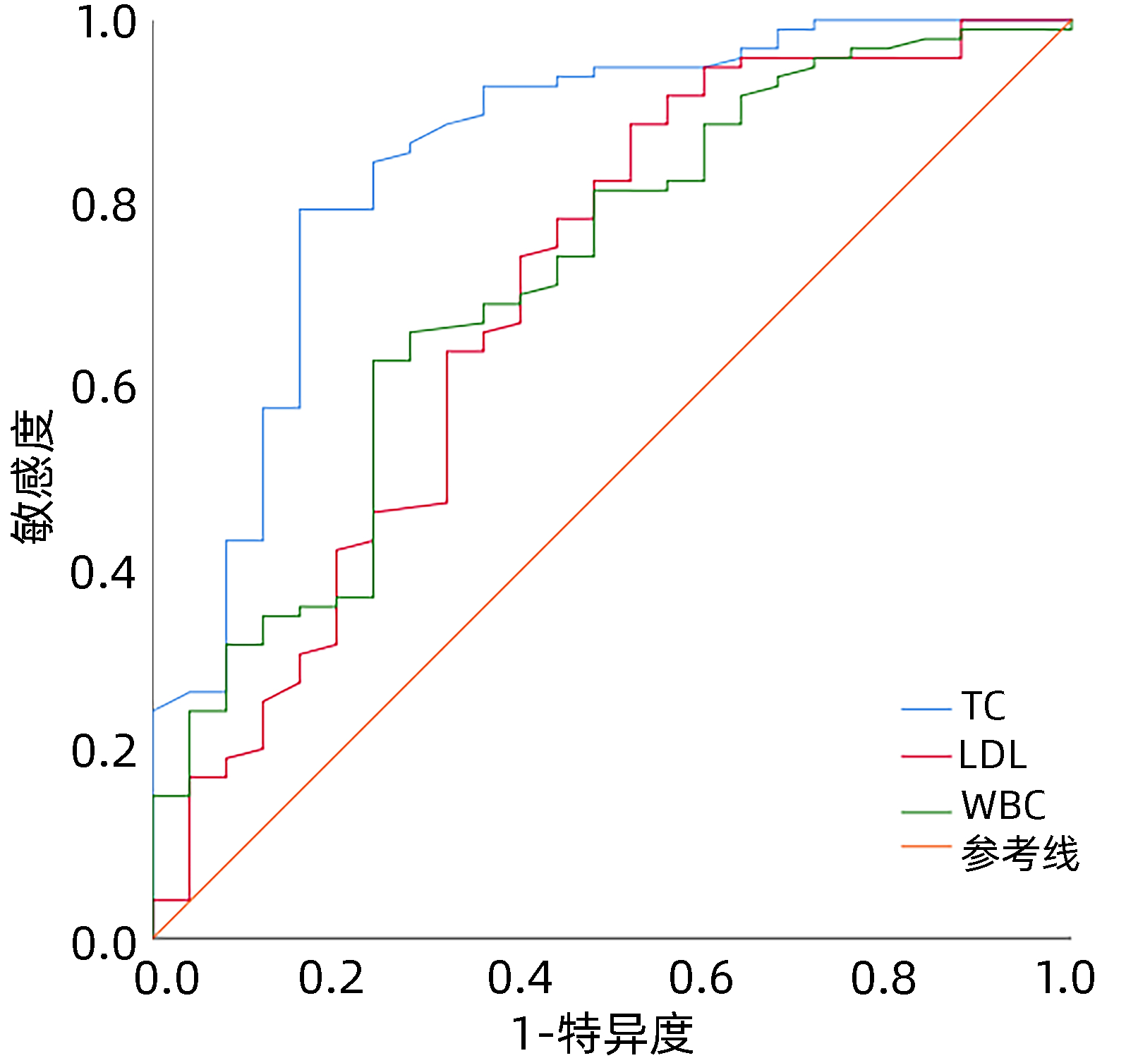 目的  分析血脂指标在慢加急性肝衰竭前期(pre-ACLF)和慢加急性肝衰竭(ACLF)组间的差异,并探讨患者进展的危险因素。  方法  回顾性分析西部战区总医院2012年1月—2020年12月ACLF组(n=118)和pre-ACLF组(n=44)患者的基线年龄、白蛋白、肌酐、血常规、血脂等指标。计量资料服从正态分布的两组间比较采用成组t检验;计量资料不服从正态分布的两组间比较采用Mann-Whitney U检验。计数资料两组间比较采用χ2检验。通过Logistic二元回归进行多因素分析,筛选独立预测因素。使用受试者工作特征曲线(ROC曲线)比较指标的敏感度和特异度,通过约登指数计算临界值。  结果  比较两组间年龄、肌酐、白蛋白、TBil、INR、ALT、AST、TG、TC、HDL、LDL、WBC和中性粒细胞计数水平的差异,发现ACLF组患者的TC[2.02(1.56~2.37) mmol/L vs 3.01(2.57~3.66) mmol/L,Z=5.411,P<0.001]、HDL[0.40(0.25~0.49) mmol/L vs 0.62(0.47~0.75) mmol/L, Z=4.781, P<0.001]、LDL [1.52(1.22~1.84) mmol/L vs 1.93(1.49~2.36) mmol/L, Z=3.146, P=0.002] 水平显著低于pre-ACLF组,ACLF组患者的TBil[352.13(284.32~ 451.19) μmol/L vs 135.80(112.80~154.68) μmol/L, Z=-9.775, P<0.001]、INR[1.96(1.71~2.51)vs 1.39(1.33~1.44), Z=-9.776, P<0.001]、WBC[6.74(5.07~9.19)×109/L vs 5.04(4.13~7.09)×109/L, Z=-3.985, P<0.001]、中性粒细胞水平[4.67(3.40~7.06)×109/L vs 3.30(2.72~5.01)×109/L, Z=-3.676, P<0.001]显著高于pre-ACLF组,两组间年龄、肌酐、白蛋白、ALT、AST和TG水平无显著差异(P值均>0.05)。进一步通过Logistic回归分析发现TC(OR=0.003, 95%CI:0.000~0.068)、LDL(OR=61.901, 95%CI:3.354~1 142.558)、WBC(OR=3.175, 95%CI:1.097~9.185)具有独立预测价值(P值均<0.05),ROC结果显示TC的AUC为0.852,LDL敏感度为0.887,TC特异度为0.840。  结论  血脂指标在pre-ACLF进展到ACLF过程中下降,提示临床医师需要关注pre-ACLF阶段脂质的变化,并及时调整营养方案。
