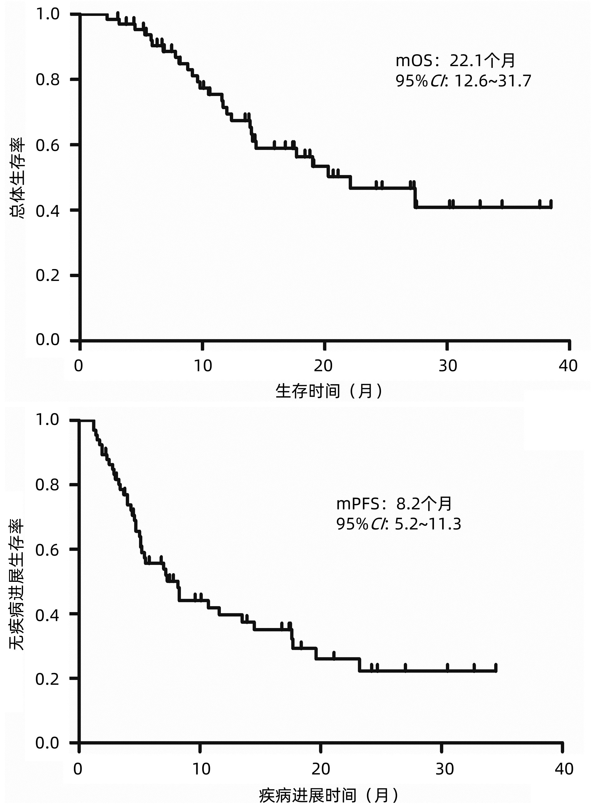 目的  本研究旨在观察FOLFOX方案持续肝动脉灌注化疗(HAIC)及其综合治疗方案对中晚期肝细胞癌患者的临床疗效并分析影响预后的因素。  方法  回顾性收集南方医科大学南方医院2018年9月—2021年11月行FOLFOX方案持续HAIC的66例中晚期肝细胞癌患者临床资料。观察治疗后患者的客观缓解率、疾病控制率、中位无疾病进展生存时间(mPFS)和中位生存时间(mOS)并记录治疗相关不良反应。针对伴有门静脉癌栓的患者,评价治疗对门静脉癌栓的疗效。采用Kaplan-Meier法进行生存分析。采用Cox回归分析影响预后的因素。  结果  按照RECIST1.1标准,FOLFOX-HAIC及其综合治疗方案治疗66例中晚期肝细胞癌患者的客观缓解率和疾病控制率分别为33.3%(22/66)、86.4%(57/66),mPFS和mOS分别为8.2个月和22.1个月。其中39例合并门静脉癌栓的肝癌患者中完全缓解2例,部分缓解8例,稳定24例,进展5例。客观缓解率为25.6%(10/39),疾病控制率为87.2%(34/39)。不良反应主要为消化道反应16.7%(11/66)、发热12.1%(8/66)、肝区疼痛10.6%(7/66)、骨髓抑制3.0%(2/66)和造影剂过敏3.0%(2/66)。无Ⅳ级以上的毒副反应。无并发症导致的死亡。Cox分析显示肝外转移(HR=2.668, 95% CI:1.357~5.245)和凝血酶原时间(HR=1.282, 95%CI:1.080~1.630)是影响患者PFS的独立危险因素(P值均<0.05), AST水平(HR=1.008, 95%CI:1.002~1.013)和凝血酶原时间(HR=1.303, 95%CI:1.046~1.630)是影响患者OS的独立危险因素(P值均<0.05)。  结论  FOLFOX-HAIC及其综合治疗方案治疗中晚期肝细胞癌有一定的疗效,不良反应可控。