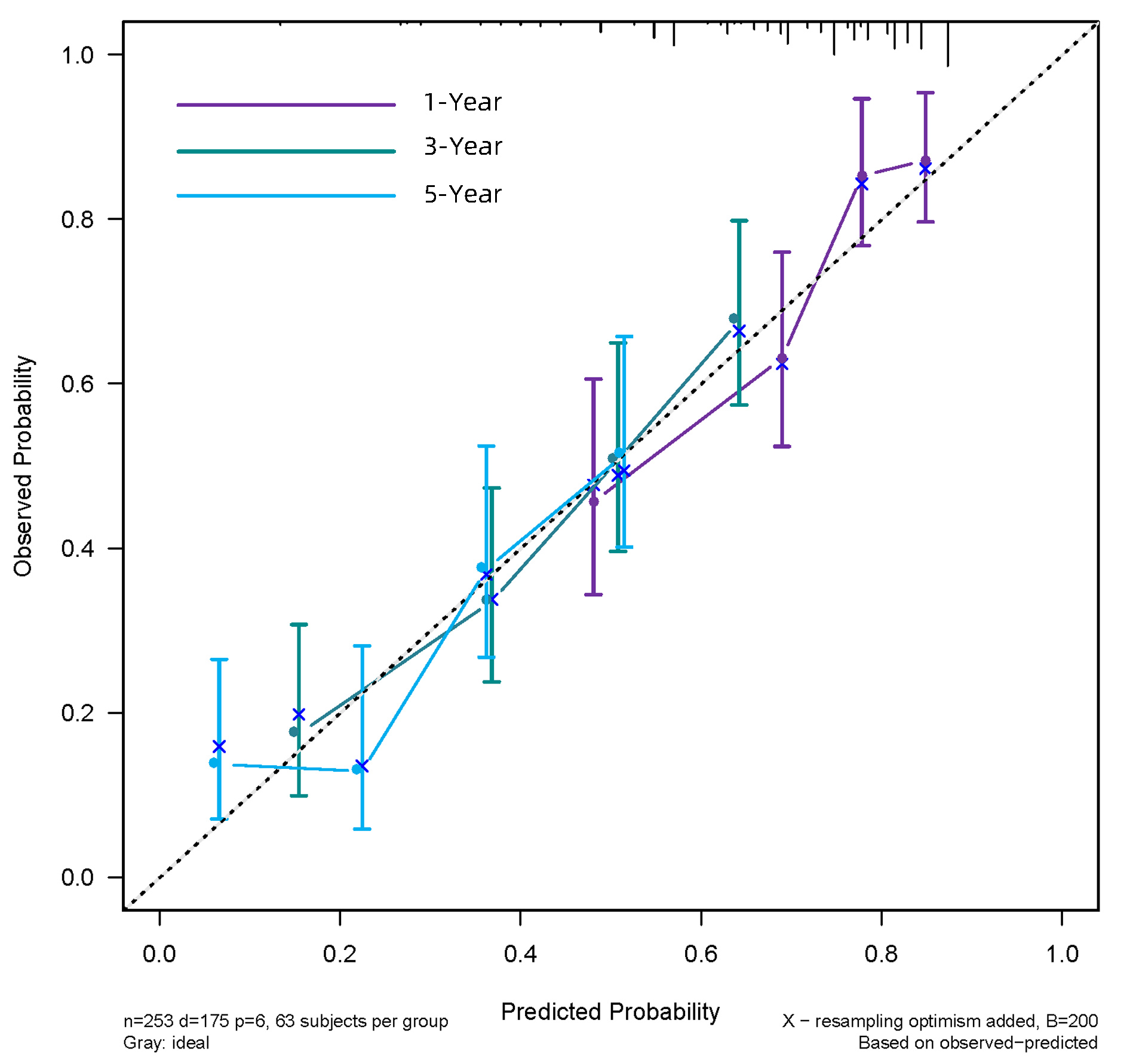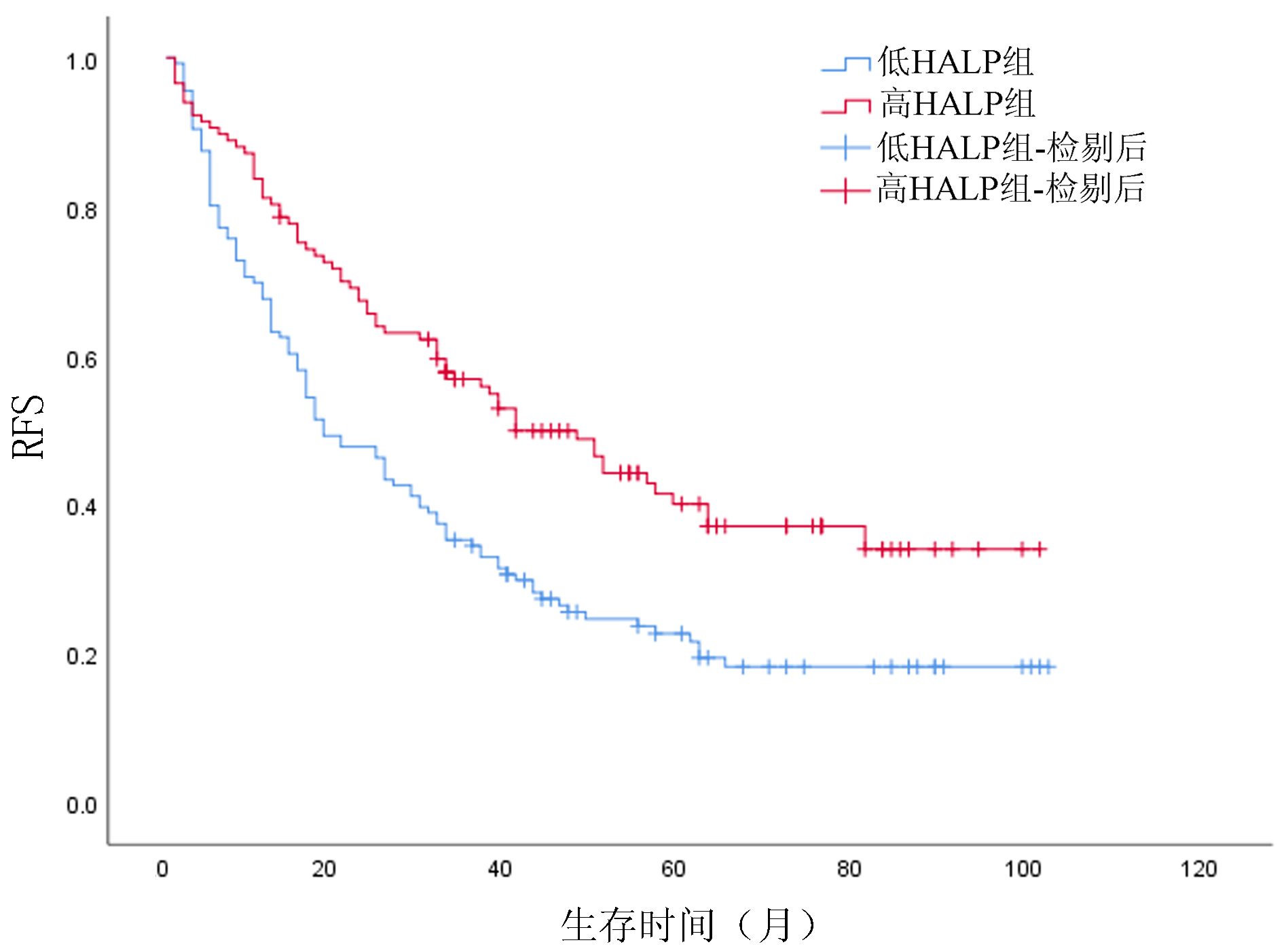 目的  探讨HALP评分在肝细胞癌(HCC)患者肝切除术后预后评估中的应用价值,分析基于HALP评分的列线图模型能否有效预测患者术后生存情况。  方法  回顾性分析2013年7月—2020年3月在西南医科大学附属医院肝胆外科手术治疗的253例HCC患者临床资料。通过绘制ROC曲线,计算出HALP和其他有关指标的最佳截断值。采用χ2检验分析HALP与临床病理特征之间的关系。使用Kaplan-Meier方法绘制生存曲线,并采用Log-rank检验进行比较。进行单因素分析和多因素Cox回归模型,分析HALP及其他临床参数与患者预后的关系。通过R 3.6软件构建列线图,使用C指数及校准图评价列线图的预测能力,通过净重新分类指数(NRI)、综合判别改善指数(IDI)比较列线图模型和传统模型的预测能力。  结果  Kaplan-Meier分析显示高HALP组患者OS、RFS优于低HALP组,差异均有统计学意义(P值均<0.001)。单因素Cox回归分析显示WBC、GGT、ALP、AFP、手术方式、微血管侵犯、TNM分期、分化程度、HALP、AST/ALT、NLR、MLR均与总生存期(OS)显著相关(P值均<0.05),将单因素Cox回归分析中有统计学意义的变量纳入多因素Cox回归分析,结果显示HALP、AST/ALT、ALP、AFP、分化程度、TNM分期是HCC患者术后OS的独立影响因素(P值均<0.05)。单因素Cox回归分析显示GGT、ALP、AFP、微血管侵犯、TNM分期、分化程度、HALP、AST/ALT、NLR、MLR均与无复发生存期(RFS)显著相关(P值均<0.05);多因素Cox回归分析,结果显示HALP、AST/ALT、NLR、ALP、AFP、TNM分期是HCC患者术后RFS的独立影响因素(P值均<0.05)。根据多因素分析结果分别构建HCC患者OS、RFS的列线图,计算预测OS列线图的C指数为0.732(0.691~0.774),预测1、3、5年生存率的AUC分别为0.795、0.791、0.775。预测RFS列线图的C指数为0.677(0.637~0.717),预测1、3、5年生存率的AUC分别为0.742、0.733、0.716;并且1、3、5年OS、RFS校准图表现出了较好的拟合度。  结论  术前低水平HALP是接受手术治疗的HCC患者长期预后不佳的预测因素,基于HALP评分的列线图模型优于BCLC分期模型,可以更好地预测HCC的预后情况。