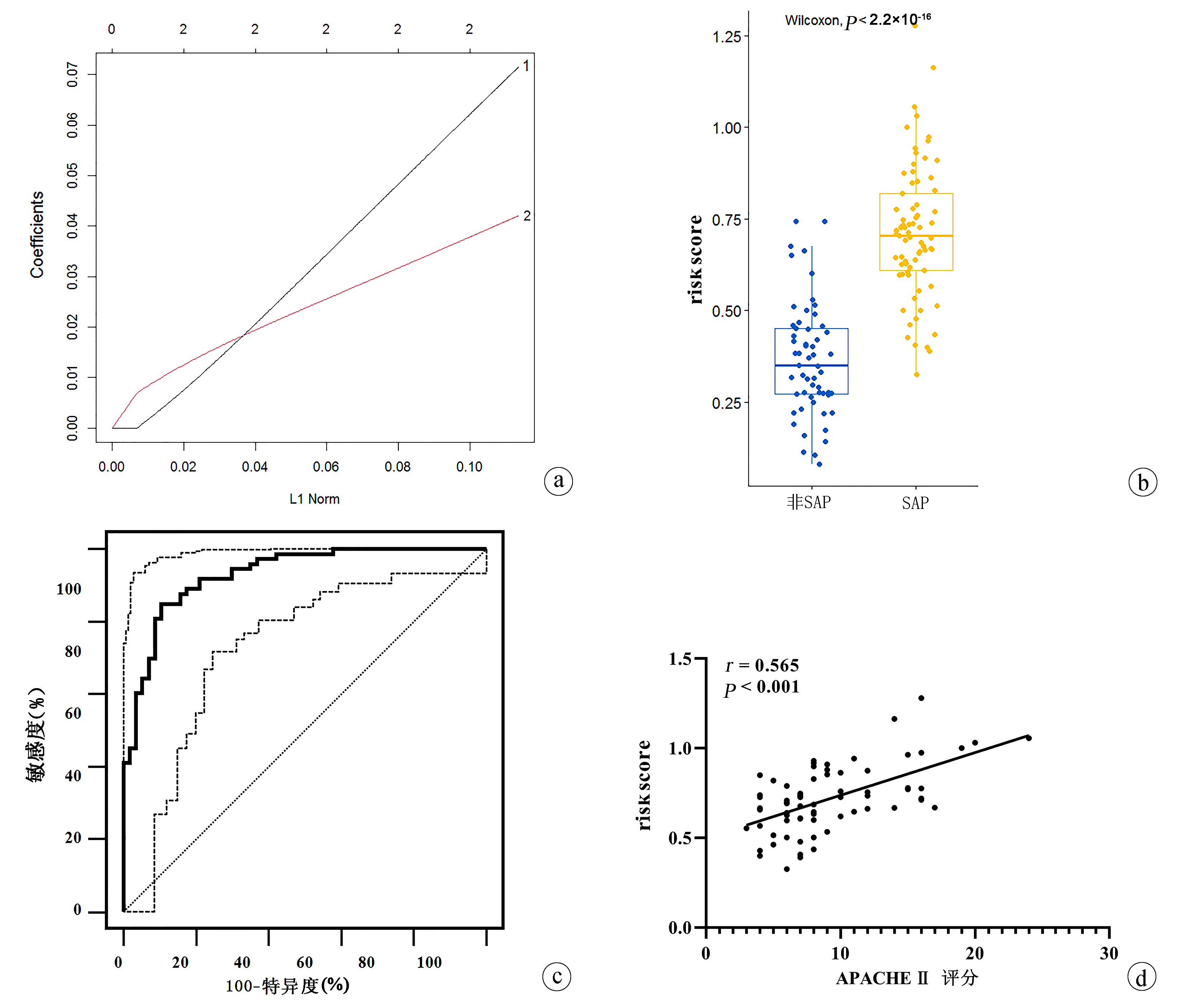 目的  评估血清细胞因子在重症急性胰腺炎(SAP)早期诊断中的价值, 并利用LASSO算法构建复合指标的数理模型以提高对SAP诊断的准确性。  方法  纳入2019年1月-2022年6月在常熟市第一人民医院就诊的130例急性胰腺炎患者, 其中SAP患者73例, 非SAP患者57例。收集所有患者的外周血清样本并通过Luminex xMAP液相芯片技术完成13种血清细胞因子的精准检测。同时, 所有患者均进行APACHE Ⅱ、BISAP和CTSI评分。使用Kolmogorov-Smirnov法进行正态性检验, 对符合正态分布的计量资料两组间比较采用成组t检验; 对非正态分布的计量资料两组间比较采用Mann-Whitney U检验。计数资料两组间比较采用χ2检验。此外, 通过二元Logistic回归分析评估细胞因子对SAP的影响, 应用线性回归分析评估细胞因子与SAP疾病的严重程度之间的关联。偏相关分析在校正协变量(年龄、性别、BMI、高血压、糖尿病病史)后分析细胞因子与SAP疾病的严重程度评分的关联性。利用LASSO算法构建复合指标的数理模型, 并采用受试者工作特征曲线(ROC曲线)分析血清细胞因子对SAP临床诊断的效能, 计算曲线下面积(AUC)。  结果  非SAP组APACHE Ⅱ、BISAP和CTSI评分、改良Marshall评分均低于SAP组, 差异均有统计学意义(P值均 < 0.001)。SAP组患者IFN-γ、IL-1β、IL-6、IL-8、TNF-α水平均高于非SAP组, IL-12水平明显低于非SAP组, 差异均有统计学意义(P值均 < 0.05)。Logistic回归分析结果显示, IFN-γ(OR=1.190, 95%CI: 1.036~1.367, P=0.014)、IL-6(OR=1.148, 95%CI: 1.070~1.231, P < 0.001)和TNF-α(OR=1.100, 95%CI: 1.048~1.155, P < 0.001)为SAP的独立影响因素。偏相关分析提示, 在校正了性别、年龄、BMI、慢性疾病史(糖尿病、高血压)后, SAP患者IL-6和TNF-α的水平与APACHE Ⅱ评分均呈显著正相关(IL-6:r=0.503, P < 0.001;TNF-α: r=0.557, P < 0.001)。线性回归分析显示, SAP患者中IL-6和TNF-α水平均与APACHE Ⅱ评分有关(IL-6:β=0.049, P=0.044;TNF-α: β=0.054, P=0.046), 且IL-6和TNF-α存在交互作用, 影响APACHE Ⅱ评分。ROC曲线分析显示, LASSO算法联合IL-6和TNF-α构建的风险评分区分SAP和非SAP的AUC值最大(AUC=0.925), 而IL-6和TNF-α的AUC分别为0.885、0.878;偏相关分析发现, 在校正性别、年龄、BMI、慢性疾病史(糖尿病、高血压)后, SAP患者风险评分与APACHE Ⅱ评分呈显著正相关(r=0.565, P < 0.001)。  结论  血清IL-6和TNF-α水平可反映AP疾病严重程度。联合血清IL-6和TNF-α构建的风险评分可显著提高SAP早期诊断的准确性, 对SAP的临床诊疗具有重要的临床价值。