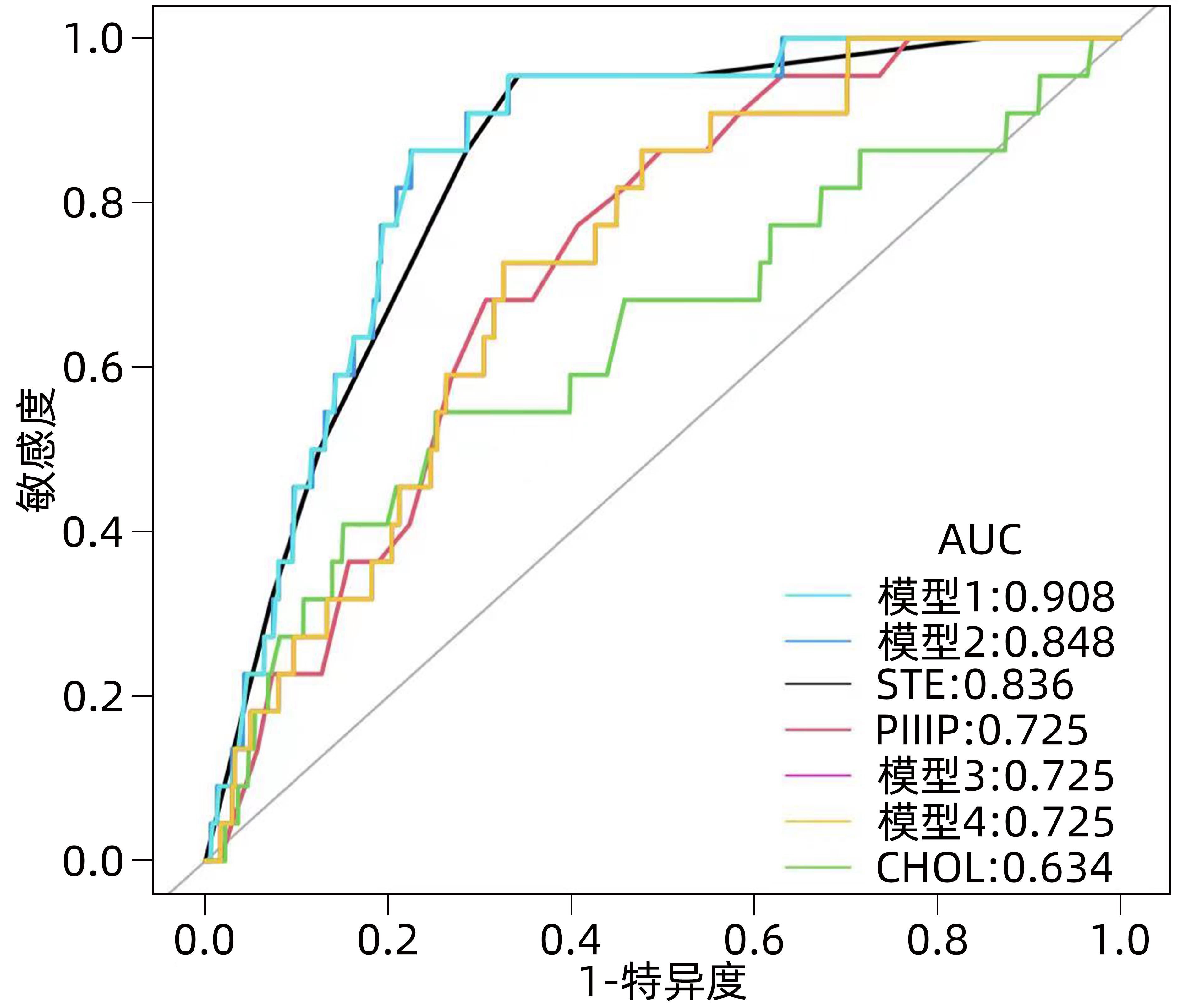 参数 AUC 95%CI P值 特异度 敏感度 STE 0.836 0.773~0.899 <0.001 0.657 7 0.954 5 PⅢP 0.725 0.641~0.810 <0.001 0.693 3 0.681 8 CHOL 0.634 0.502~0.766 <0.001 0.748 0 0.545 5 模型1 0.908 0.790~0.937 <0.001 0.773 4 0.963 6 模型2 0.848 0.790~0.907 <0.001 0.775 3 0.863 6 模型3 0.725 0.638~0.812 <0.001 0.674 0 0.727 3 模型4 0.725 0.638~0.812 <0.001 0.674 0 0.727 3 注:模型1,STE+PⅢP+CHOL;模型2,STE+PⅢP,模型3,STE+CHOL,模型4,PⅢP+CHOL。 -