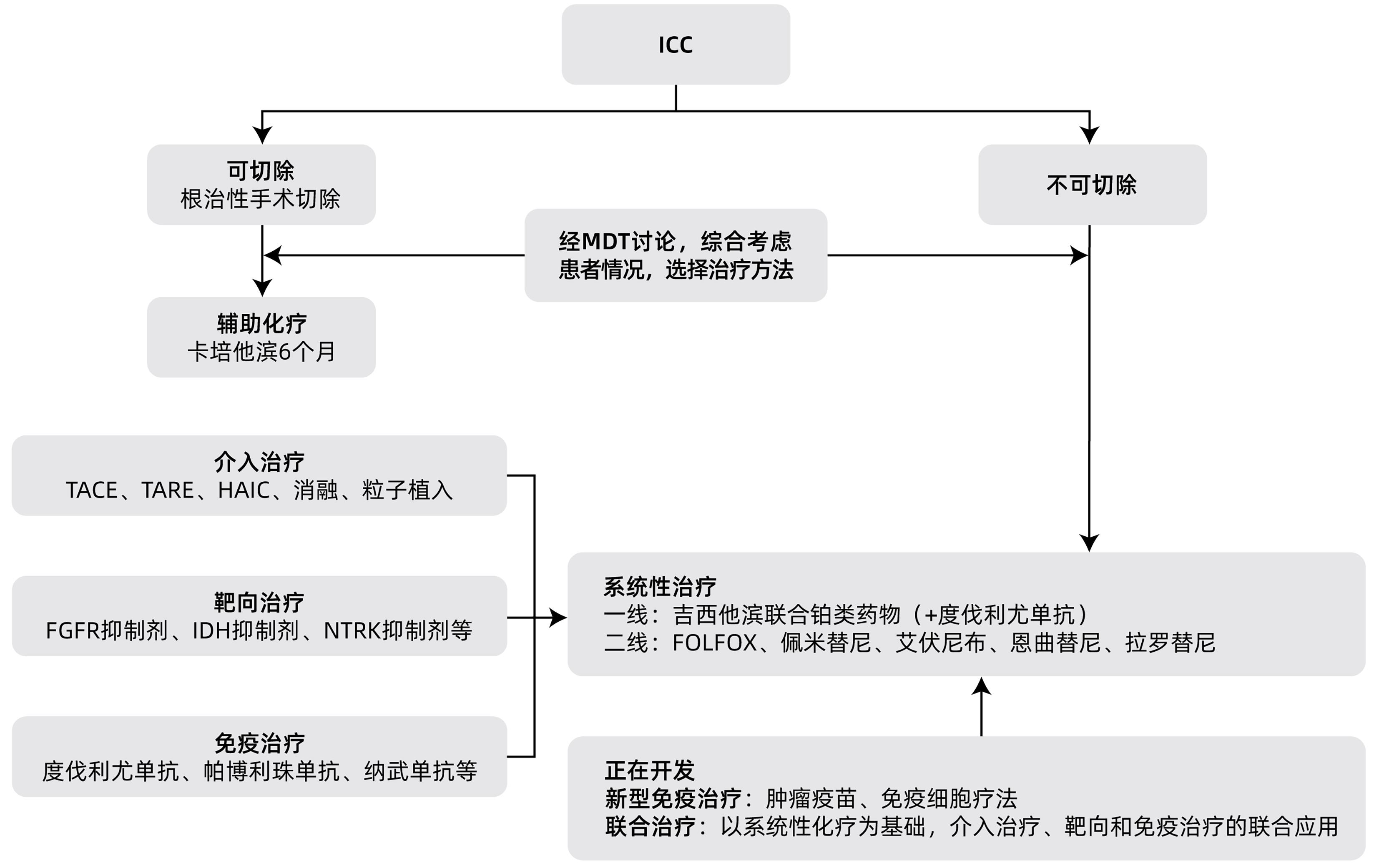 摘要: 肝内胆管癌(ICC)是原发性肝癌相对少见的类型,近年来发病率逐渐增加。由于其发病隐匿,临床症状不典型,大部分患者确诊时已处于疾病中晚期阶段,因此及时诊断和治疗非常重要。早期ICC患者的标准治疗方案是根治性手术切除,中晚期患者则以系统性化疗为基础,联合介入治疗、靶向和免疫治疗等。本文拟对ICC的诊疗进展进行综述。Abstract: Intrahepatic cholangiocarcinoma (ICC) is a relatively rare type of primary liver cancer, and its incidence rate has gradually increased in recent years. Due to its insidious onset and atypical clinical symptoms, most patients are already in the advanced stage of the disease at the time of confirmed diagnosis, and therefore, timely diagnosis and treatment are of great importance. Radical surgical resection is the standard treatment regimen for early-stage ICC patients, while systemic chemotherapy is the basic treatment for patients with advanced ICC and is often combined with interventional treatment, targeted therapy, and immunotherapy. This article reviews the advances in the diagnosis and treatment of ICC.