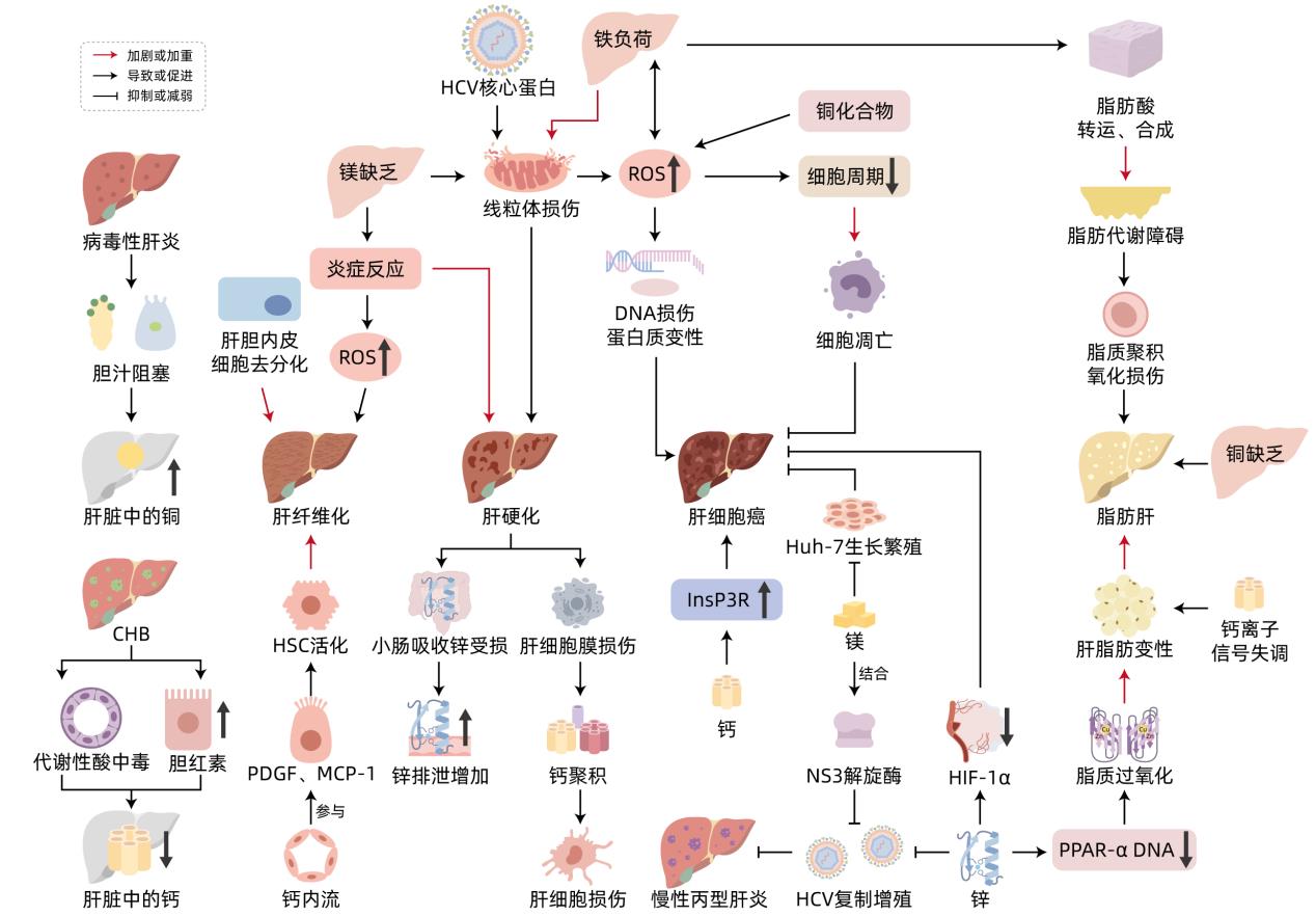 [1] RODRÍGUEZ MJ, SABAJ M, TOLOSA G, et al. Maresin-1 prevents liver fibrosis by targeting Nrf2 and NF-κB, reducing oxidative stress and inflammation[J]. Cells, 2021, 10( 12): 3406. DOI: 10.3390/cells10123406. [2] WANG CY, BABITT JL. Liver iron sensing and body iron homeostasis[J]. Blood, 2019, 133( 1): 18- 29. DOI: 10.1182/blood-2018-06-815894. [3] LIU T, LIU YL, ZHANG FY, et al. Association of copper metabolism disorder with cell damage and liver diseases[J]. J Clin Hepatol, 2023, 39( 9): 2244- 2251. DOI: 10.3969/j.issn.1001-5256.2023.09.032.柳涛, 刘雅丽, 张飞宇, 等. 铜代谢失调与细胞损伤及肝病的关系[J]. 临床肝胆病杂志, 2023, 39( 9): 2244- 2251. DOI: 10.3969/j.issn.1001-5256.2023.09.032. [4] HIMOTO T, MASAKI T. Associations between zinc deficiency and metabolic abnormalities in patients with chronic liver disease[J]. Nutrients, 2018, 10( 1): 88. DOI: 10.3390/nu10010088. [5] TIAN H, XIANG P, ZHOU WH, et al. Correlation between the physiological characteristics of magnesium and cirrhosis[J]. Hebei Med J, 2021, 43( 8): 1246- 1251. DOI: 10.3969/j.issn.1002-7386.2021.08.029.田慧, 向平, 周卫华, 等. 镁离子的生理特点及与肝硬化的关系[J]. 河北医药, 2021, 43( 8): 1246- 1251. DOI: 10.3969/j.issn.1002-7386.2021.08.029. [6] OLIVA-VILARNAU N, HANKEOVA S, VORRINK SU, et al. Calcium signaling in liver injury and regeneration[J]. Front Med(Lausanne), 2018, 5: 192. DOI: 10.3389/fmed.2018.00192. [7] SI MJ. Research progress on the correlation between abnormal iron metabolism and liver diseases[J]. Med Equip, 2022, 35( 2): 188- 191. DOI: 10.3969/j.issn.1002-2376.2022.02.077.司茂杰. 铁代谢异常与肝脏疾病相关性的研究进展[J]. 医疗装备, 2022, 35( 2): 188- 191. DOI: 10.3969/j.issn.1002-2376.2022.02.077. [8] ZHAO JY, LI YW, LI L. The role of iron and hepcidin in hepatic fibrosis[J]. Prog Physiol Sci, 2010, 41( 3): 183- 188.赵晋英, 李艳伟, 李琳. 铁和铁调素在肝纤维化中的作用[J]. 生理科学进展, 2010, 41( 3): 183- 188. [9] SIKORSKA K, BERNAT A, WROBLEWSKA A. Molecular pathogenesis and clinical consequences of iron overload in liver cirrhosis[J]. Hepatobiliary Pancreat Dis Int, 2016, 15( 5): 461- 479. DOI: 10.1016/s1499-3872(16)60135-2. [10] KEITH B, JOHNSON RS, SIMON MC. HIF1α and HIF2α: Sibling rivalry in hypoxic tumour growth and progression[J]. Nat Rev Cancer, 2011, 12( 1): 9- 22. DOI: 10.1038/nrc3183. [11] ZHANG LJ, DAI XZ, WANG L, et al. Iron overload accelerated lipid metabolism disorder and liver injury in rats with non-alcoholic fatty liver disease[J]. Front Nutr, 2022, 9: 961892. DOI: 10.3389/fnut.2022.961892. [12] ZHANG LL, CHENG N, WANG X. Metabolic mechanism of copper and its toxic effect on liver[J]. Chin J Gastroenterol, 2016, 21( 12): 762- 764. DOI: 10.3969/j.issn.1008-7125.2016.12.016.张亮亮, 程楠, 王训. 铜代谢机制及其对肝脏的毒性作用[J]. 胃肠病学, 2016, 21( 12): 762- 764. DOI: 10.3969/j.issn.1008-7125.2016.12.016. [13] LI YW, WAN XH, NING Q, et al. Excessive copper induces hepatocyte apoptosis and affects Bax and Bcl-2 expression in rat liver[J]. Chin J Contemp Pediatr, 2008, 10( 1): 42- 46.李毓雯, 万小华, 宁琴, 等. 铜过量负荷导致肝细胞凋亡及其对Bax Bcl-2基因表达的影响[J]. 中国当代儿科杂志, 2008, 10( 1): 42- 46. [14] YI B, CHEN Y, LIANG XH, et al. Serum copper and zinc levels of liver disease[J]. Bull Hunan Med Univ, 2002, 27( 3): 295- 296. DOI: 10.3321/j.issn:1672-7347.2002.03.037.易斌, 陈宇, 梁湘辉, 等. 肝病患者血清铜、锌含量研究[J]. 湖南医科大学学报, 2002, 27( 3): 295- 296. DOI: 10.3321/j.issn:1672-7347.2002.03.037. [15] GOU Y, ZHANG Y, QI JX, et al. Enhancing the copper(II) complexes cytotoxicity to cancer cells through bound to human serum albumin[J]. J Inorg Biochem, 2015, 144: 47- 55. DOI: 10.1016/j.jinorgbio.2014.12.012. [16] AIGNER E, STRASSER M, HAUFE H, et al. A role for low hepatic copper concentrations in nonalcoholic fatty liver disease[J]. Am J Gastroenterol, 2010, 105( 9): 1978- 1985. DOI: 10.1038/ajg.2010.170. [17] GRÜNGREIFF K, REINHOLD D, WEDEMEYER H. The role of zinc in liver cirrhosis[J]. Ann Hepatol, 2016, 15( 1): 7- 16. DOI: 10.5604/16652681.1184191. [18] LIUZZI JP, COUSINS RJ. Mammalian zinc transporters[J]. Annu Rev Nutr, 2004, 24: 151- 172. DOI: 10.1146/annurev.nutr.24.012003.132402. [19] KOHGO Y, IKUTA K, OHTAKE T, et al. Iron overload and cofactors with special reference to alcohol, hepatitis C virus infection and steatosis/insulin resistance[J]. World J Gastroenterol, 2007, 13( 35): 4699- 4706. DOI: 10.3748/wjg.v13.i35.4699. [20] GRÜNGREIFF K, GOTTSTEIN T, REINHOLD D, et al. Albumin substitution in decompensated liver cirrhosis: Don’t forget zinc[J]. Nutrients, 2021, 13( 11): 4011. DOI: 10.3390/nu13114011. [21] WEAVER BP, ZHANG YX, HISCOX S, et al. Zip4(Slc39a4) expression is activated in hepatocellular carcinomas and functions to repress apoptosis, enhance cell cycle and increase migration[J]. PLoS One, 2010, 5( 10): e13158. DOI: 10.1371/journal.pone.0013158. [22] LIN CC, HUANG JF, TSAI LY, et al. Selenium, iron, copper, and zinc levels and copper-to-zinc ratios in serum of patients at different stages of viral hepatic diseases[J]. Biol Trace Elem Res, 2006, 109( 1): 15- 24. DOI: 10.1385/BTER:109:1:015. [23] KODAMA H, TANAKA M, NAITO Y, et al. Japan’s practical guidelines for zinc deficiency with a particular focus on taste disorders, inflammatory bowel disease, and liver cirrhosis[J]. Int J Mol Sci, 2020, 21( 8): 2941. DOI: 10.3390/ijms21082941. [24] ROMANI AM. Magnesium homeostasis and alcohol consumption[J]. Magnes Res, 2008, 21( 4): 197- 204. [25] KABE Y, ANDO K, HIRAO S, et al. Redox regulation of NF-kappaB activation: Distinct redox regulation between the cytoplasm and the nucleus[J]. Antioxid Redox Signal, 2005, 7( 3-4): 395- 403. DOI: 10.1089/ars.2005.7.395. [26] LIU SJ, ZHANG HW, GU CY, et al. Associations between hepatitis B virus mutations and the r