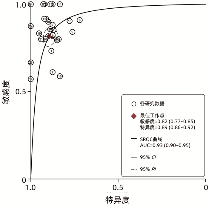 Objective To investigate the association of five noninvasive diagnostic methods for liver cirrhosis, i.e., liver stiffness measurement (LSM) on FibroScan, aspartate aminotransferase-to-platelet ratio index (APRI), fibrosis-4 (FIB-4), gamma-glutamyl transpeptidase-to-platelet ratio (GPR), and red blood cell distribution width-to-platelet ratio (RPR), with traditional Chinese medicine (TCM) syndrome types in patients with compensated hepatitis B cirrhosis. Methods A retrospective analysis was performed for the clinical data of 327 patients who were diagnosed with compensated hepatitis B cirrhosis in The First Affiliated Hospital of Henan University of Chinese Medicine from January 2017 to January 2020, and based on their TCM syndrome type, they were divided into liver depression and spleen deficiency group with 160 patients, liver-gallbladder damp-heat syndrome group with 84 patients, liver-kidney Yin deficiency group with 13 patients, spleen-kidney Yang deficiency group with 5 patients, and blood stasis obstructing the collaterals group with 65 patients. Related data were collected, including clinical data, routine blood test results, liver function, LSM, and color Doppler ultrasound findings of liver, gallbladder, spleen, and pancreas. TCM syndrome differentiation was performed, and the models of APRI, FIB-4, GPR, and RPR were established. A one-way analysis of variance was used for comparison of normally distributed continuous data between multiple groups, and the least significant difference t-test was used for further comparison between two groups; the multiple independent samples Kruskal-Wallis H rank sum test was used for comparison of non-normally distributed continuous data between multiple groups, and the one- way Kruskal-Wallis ANOVA (k-sample) was used for multiple comparison; the binary logistic regression analysis was used to investigate the association between TCM syndrome types and non-invasive diagnosis of liver cirrhosis; the receiver operating characteristic (ROC) curve was used to evaluate the diagnostic capability of five noninvasive methods for predicting TCM syndrome type in compensated hepatitis B cirrhosis. Results The logistic regression analysis showed that in the liver-gallbladder damp-heat syndrome group, aspartate aminotransferase OR=1.981, 95%CI: 1.8225-2.139, P < 0.05), and LSM (OR=2.002, 95%CI: 1.840-2.160, P < 0.05) were influencing factors for compensated hepatitis B cirrhosis; in the liver depression and spleen deficiency group, portal vein width (OR=4.402, 95%CI: 4.050-4.754, P < 0.05), LSM (OR=3.901, 95%CI: 3.589-4.213, P < 0.05), APRI (OR=1.891, 95%CI: 1.740-2.042, P < 0.05), and FIB-4 (OR=1.845, 95%CI: 1.697-1.993, P < 0.05) were influencing factors for compensated hepatitis B cirrhosis; in the blood stasis obstructing the collaterals group, LSM (OR=2.465, 95%CI: 2.268-2.662, P < 0.05), APRI (OR=1.298, 95%CI: 1.194-1.402, P < 0.05), and FIB-4 (OR=1.849, 95%CI: 1.701-1.997, P < 0.05) were influencing factors for compensated hepatitis B cirrhosis. The ROC curve analysis showed that LSM and RPR had a significantly better diagnostic value than the other methods in evaluating liver-gallbladder damp-heat syndrome, and LSM and FIB-4 had a significantly better diagnostic value than the other methods in evaluating liver depression and spleen deficiency; all five noninvasive diagnostic methods had a good value in evaluating the syndrome of blood stasis obstructing the collaterals. Conclusion The five noninvasive diagnostic methods have their own advantages in evaluating different syndrome types, which provide a reference for the diagnosis of TCM syndrome types in patients with compensated hepatitis B cirrhosis.