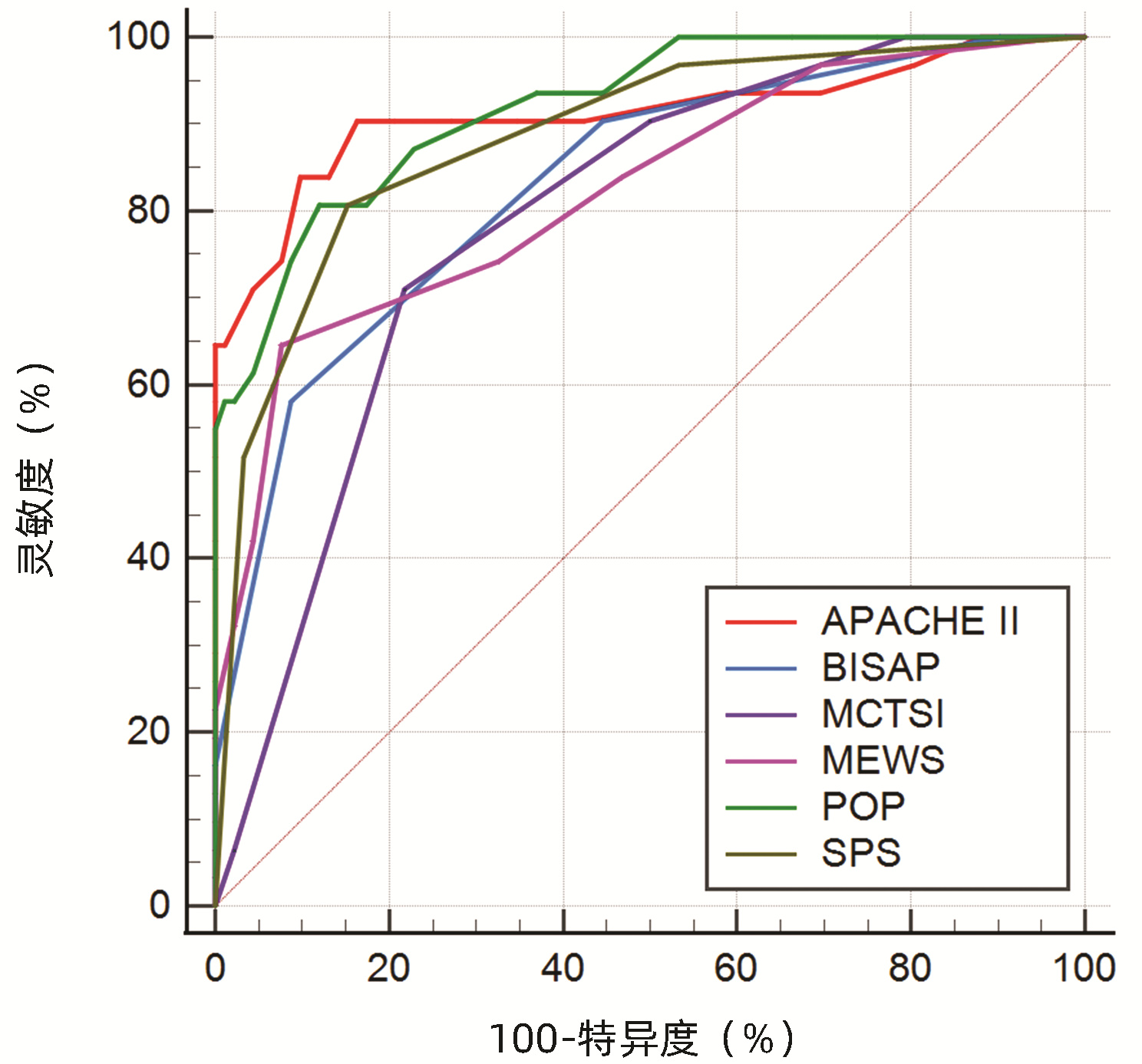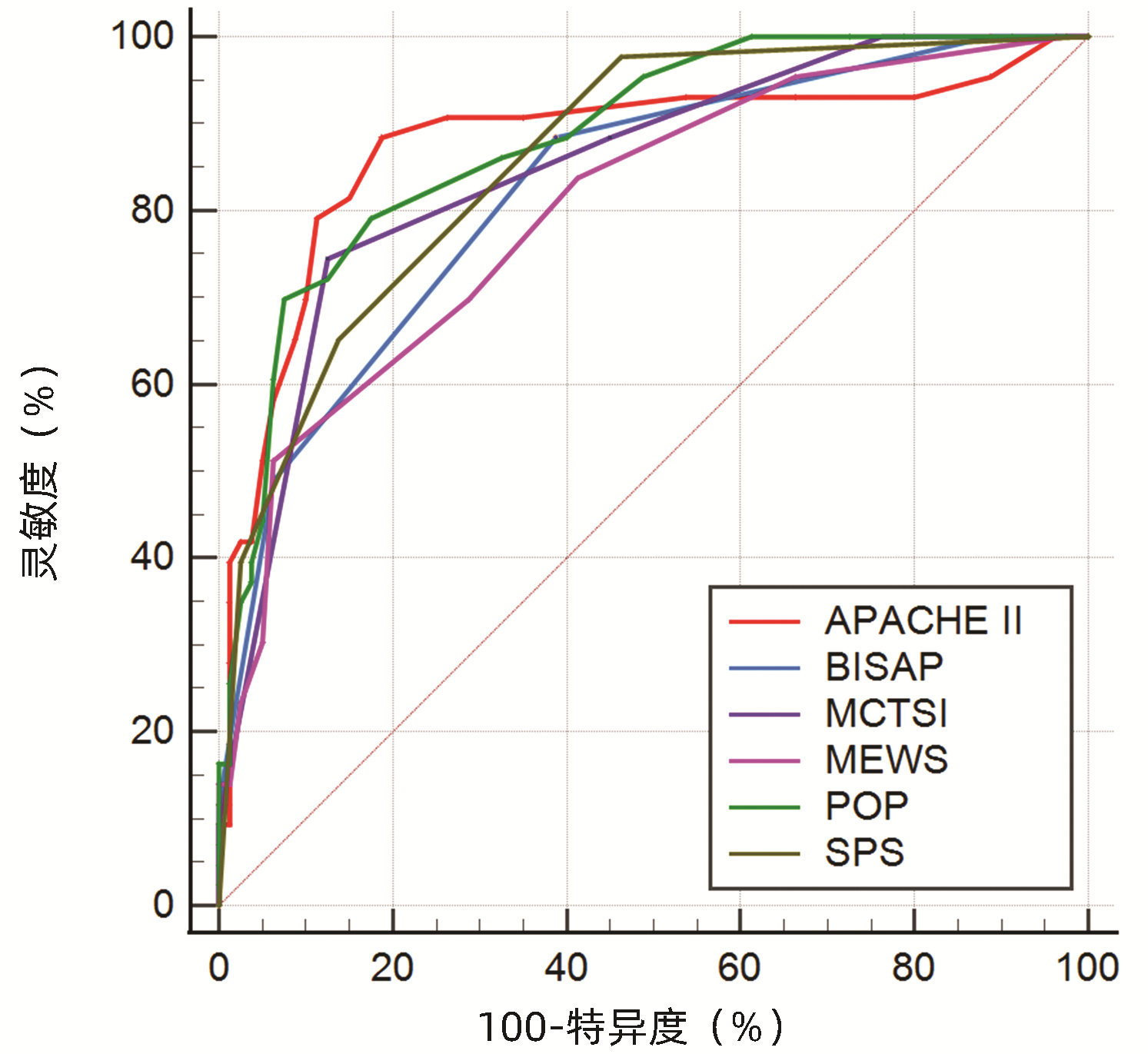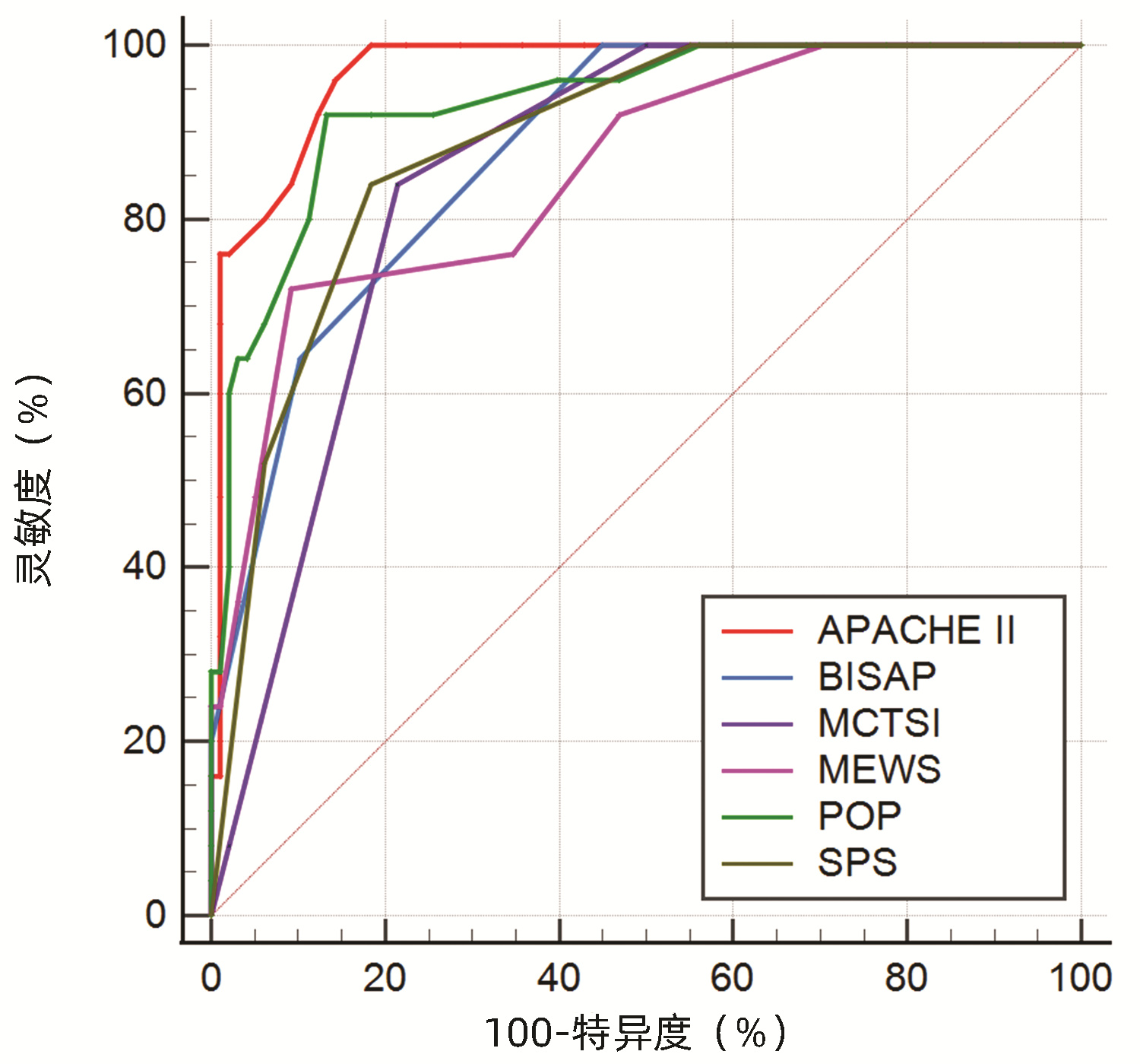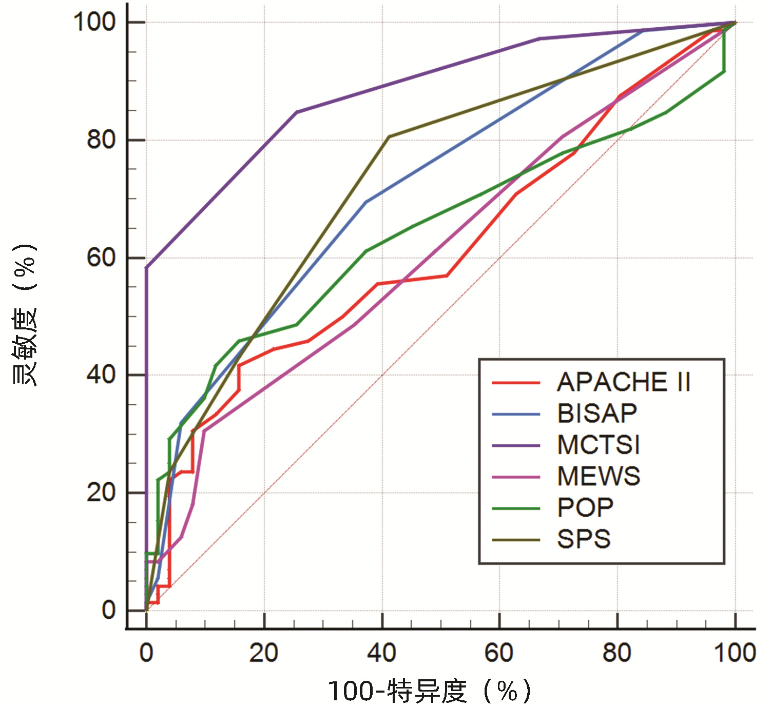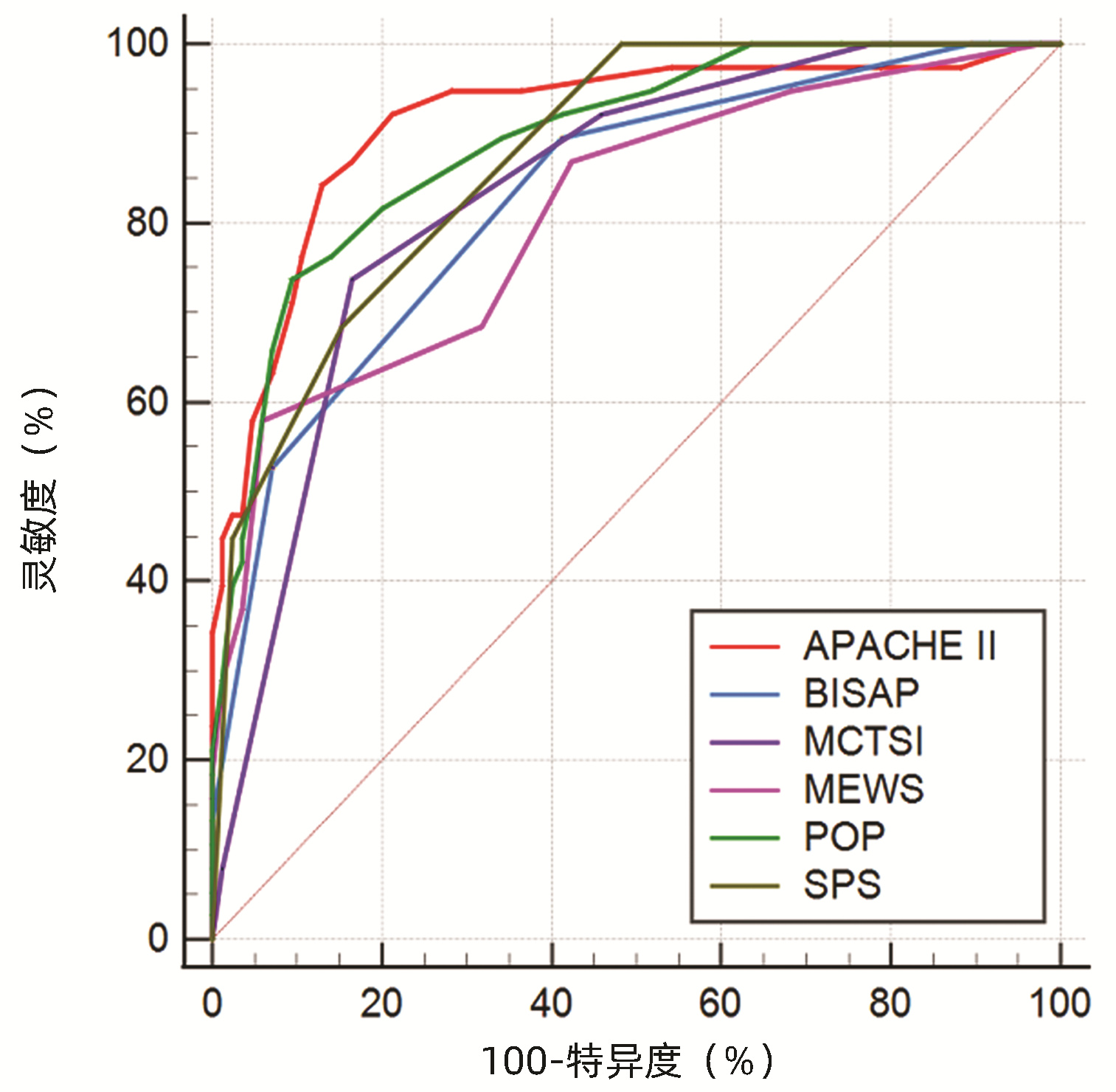 Objective To investigate the best scoring systems for predicting the severity and prognosis of hyperlipidemic acute pancreatitis (HLAP) by comparing APACHEII, BISAP, MCTSI, MEWS, POP, SPS, and PANC3 scores. Methods A retrospective analysis was performed for the data of 123 patients with HLAP who were hospitalized and treated in The Second Affiliated Hospital of Kunming Medical University from October 2017 to January 2022. The patients were divided into mild acute pancreatitis (MAP) group with 24 patients, moderate- severe acute pancreatitis (MSAP) group with 56 patients, and severe acute pancreatitis (SAP) group with 43 patients, and the three groups were compared in terms of basic data and scores of the above scoring systems. The Kruskal-Wallis H test was used for comparison of non-normally distributed continuous data between multiple groups; the chi-square test was used for comparison of categorical data between groups. MedCalc software was used to plot the receiver operating characteristic (ROC) curve, and the area under the ROC curve (AUC) was used to compare the value of these scoring systems in predicting disease severity and local and systemic complications in HLAP patients. Results There were significant differences between the three groups in diabetes mellitus (χ2=6.880, P < 0.05), length of hospital stay (H=26.494, P < 0.001), local complications (χ2=52.211, P < 0.001), acute kidney injury (AKI) (χ2=38.247, P < 0.001), acute respiratory distress syndrome (ARDS) (χ2=79.201, P < 0.001), and multiple organ dysfunction syndrome (MODS) (χ2=45.032, P < 0.001). As for the scores of the above scoring systems, there were significant differences between the three groups in APACHE Ⅱ, BISAP, MCTSI, MEWS, POP, SPS, and PANC3 (H=47.525, 42.662, 53.545, 31.664, 49.233, 48.543, and 9.443, all P < 0.05). APACHE Ⅱ score had a significantly higher value than MEWS score in predicting SAP (Z=2.090, P < 0.05), and the other scores had a similar value, among which POP score had the largest AUC of 0.883. MCTSI score had the highest value in predicting local complications (AUC=0.886), with a sensitivity of 84.7% and a specificity of 74.5% at the cut-off value of 5. APACHE Ⅱ and POP scores had an AUC of 0.911 (95% confidence interval [CI]: 0.835-0.986, P < 0.001) and 0.920 (95%CI: 0.866-0.974, P < 0.001), respectively, in predicting AKI; APACHE Ⅱ score had a higher predictive value than MCTSI and MEWS scores, POP score had a higher predictive value than MCTSI, MEWS, and BISAP scores, and SPS score had a higher predictive value than MCTSI score. APACHE Ⅱ score had an AUC of 0.914 (95%CI: 0.854-0.973, P < 0.001) in predicting ARDS and had a higher predictive value than BISAP and MEWS (Z=2.152 and 3.015, both P < 0.05). APACHE Ⅱ and POP scores had an AUC of 0.969 (95%CI: 0.941-0.996, P < 0.001) and 0.932 (95%CI: 0.880-0.984, P < 0.001), respectively, in predicting MODS, and APACHE Ⅱ score had a higher predictive value than SPS, BISAP, MEWS, and MCTSI. Conclusion POP score has the highest value in predicting SAP, with a comparable predictive ability to all the other scoring systems except MEWS. APACHEII and POP scores have a good value in predicting systemic complications and show a high accuracy in predicting AKI and MODS, and APACHEII score is highly accurate in predicting ARDS.