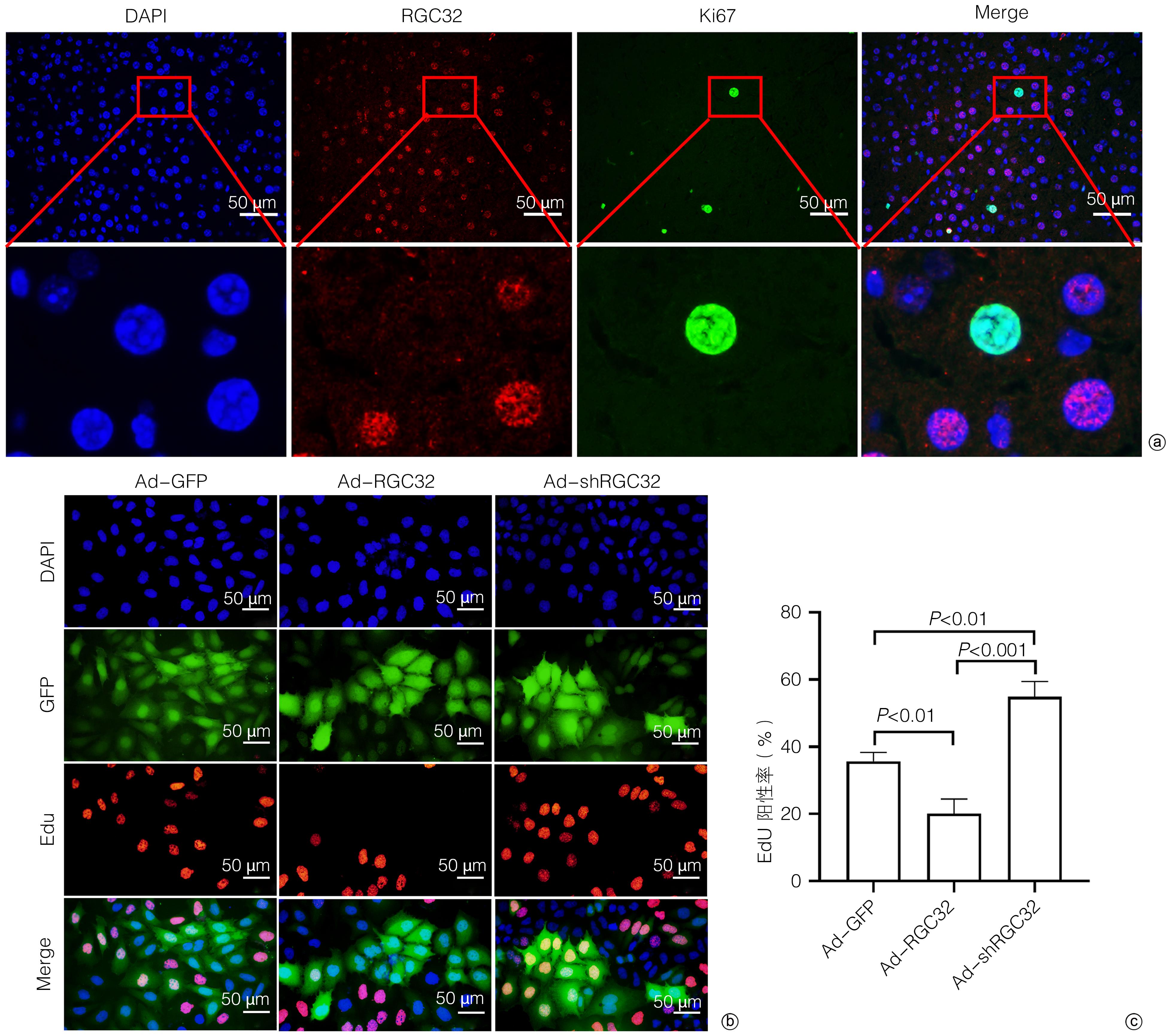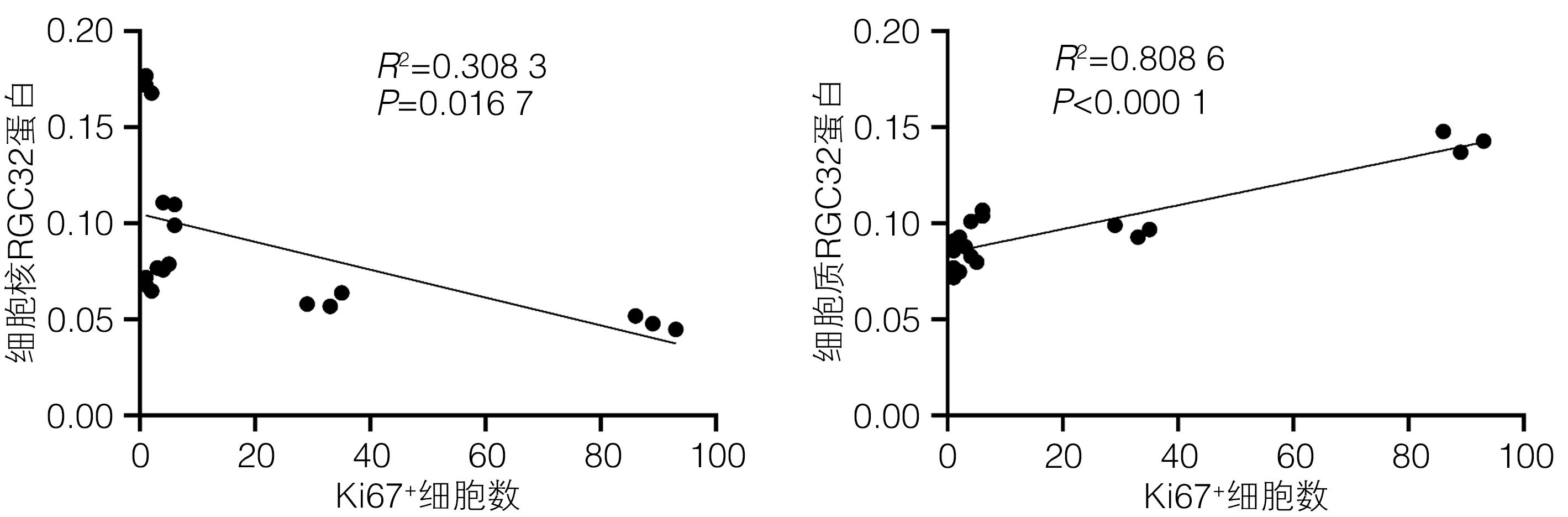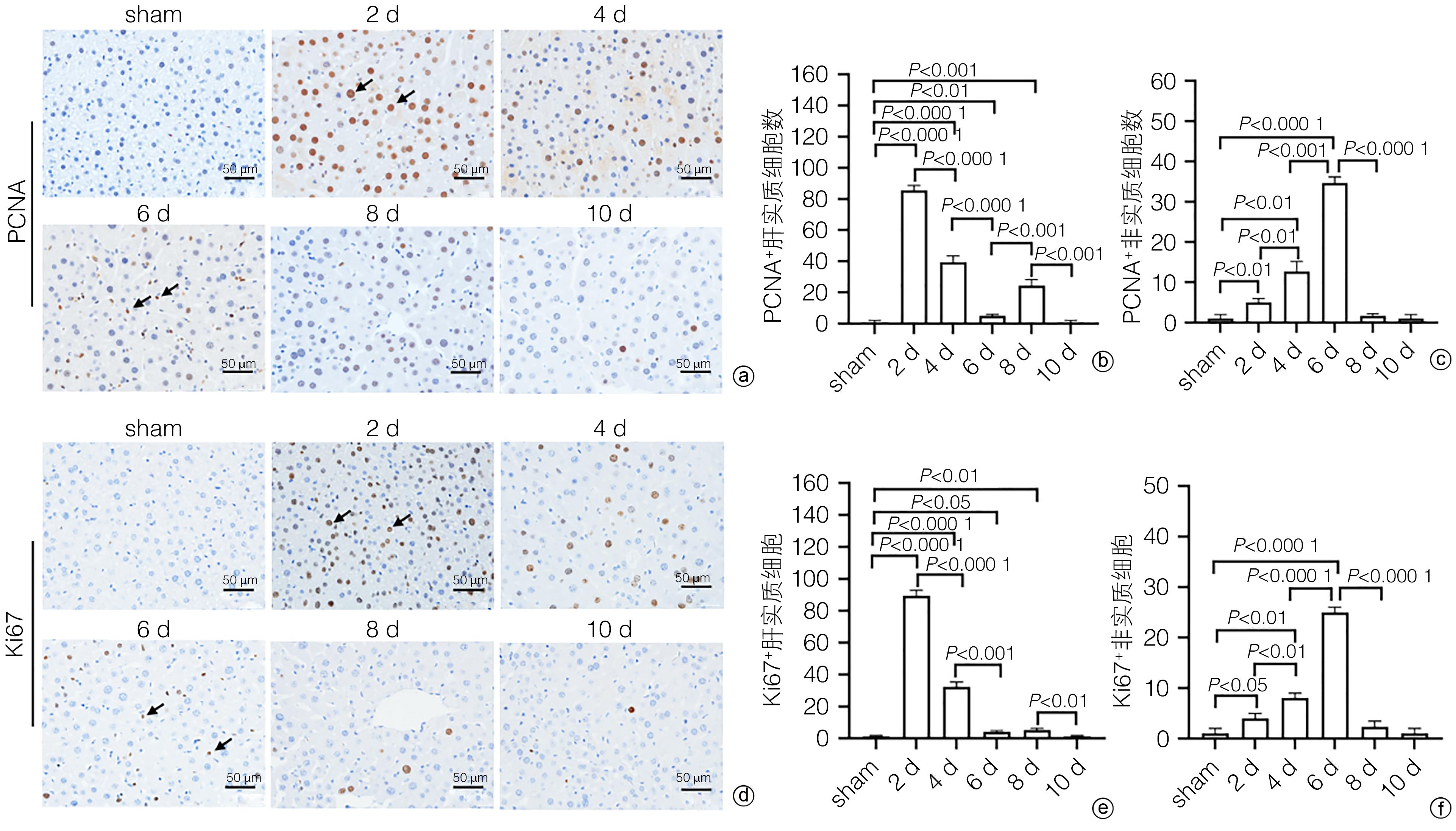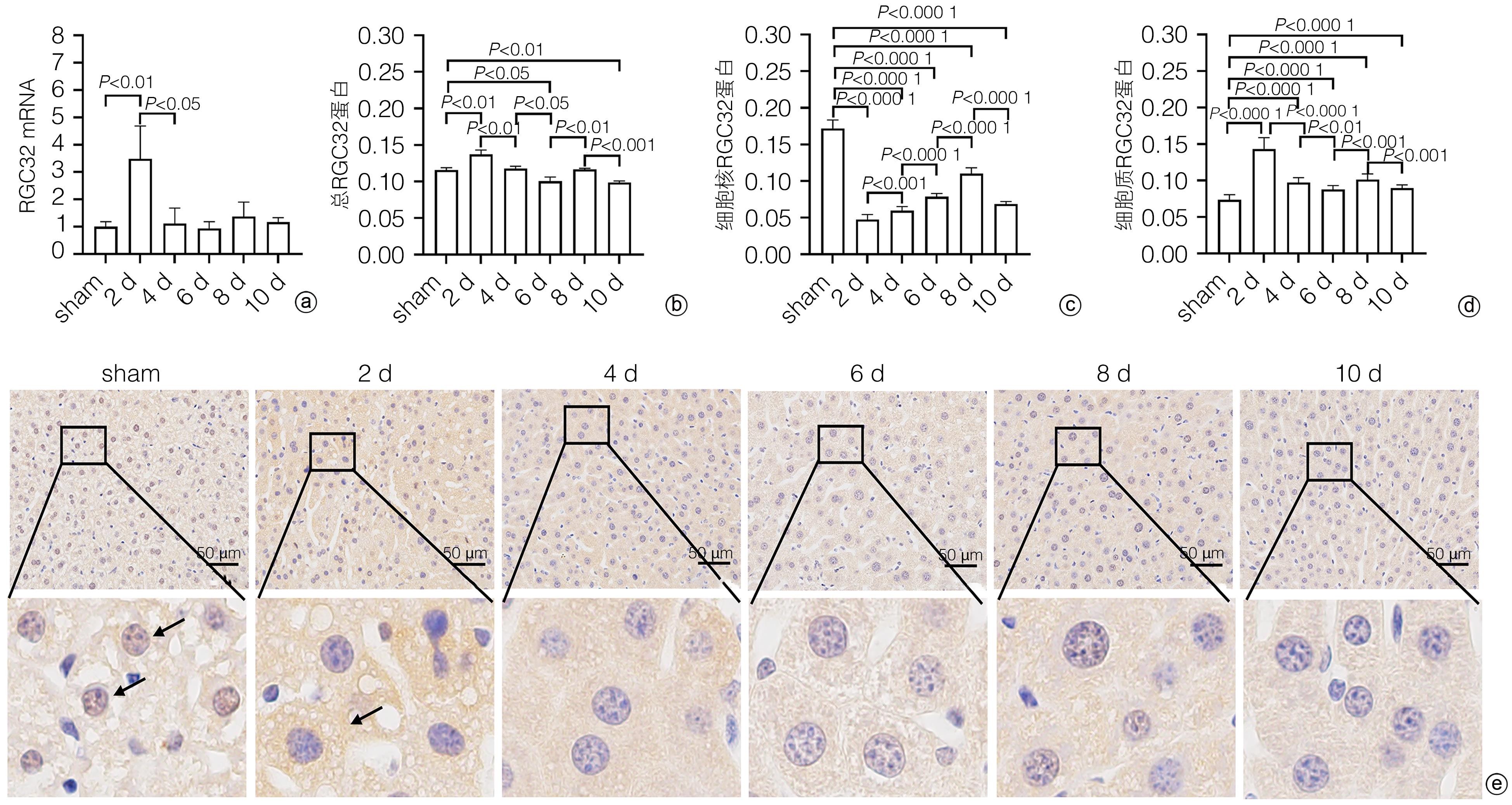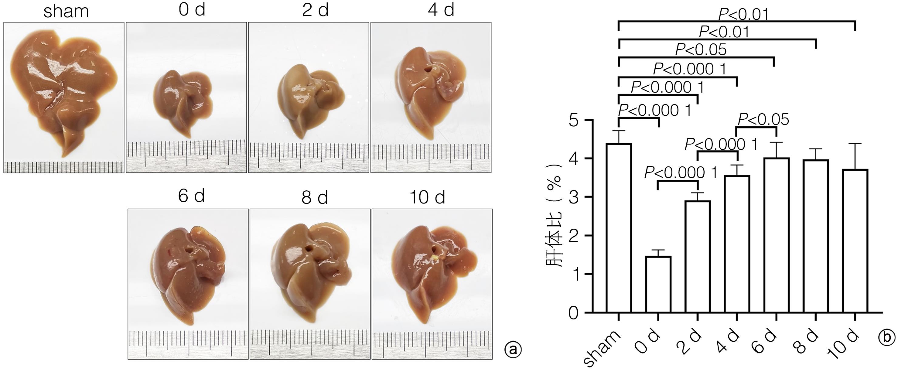Objective To investigate the expression and role of response gene to complement 32 (RGC32) in liver regeneration after partial hepatectomy (PH). Methods A total of 42 male C57BL/6 mice, aged 10 weeks, were randomly divided into control group, postoperative day 1 group (1-d group), postoperative day 2 group (2-d group), postoperative day 4 group (4-d group), postoperative day 6 group (6-d group), postoperative day 8 group (8-d group), and postoperative day 10 group (10-d group), with 6 mice in each group. In the control group, the complete liver of the mice was resected for weighing and photography as the normal control group (sham group); further, the left and middle lobes of the liver were resected for weighing and photography as the surgical control group (0-day group); the sham group and the 0-day group shared the same group of mice. After successful modeling by PH, the mice were sacrificed on days 1, 2, 4, 6, 8, and 10 after surgery, and the liver was collected to measure the change in size. HE staining and oil red O staining were used to evaluate liver histomorphological changes; serum alanine aminotransferase (ALT) and aspartate aminotransferase (AST) were measured to evaluate the changes in liver function; immunohistochemical staining was used to measure the expression of proliferating cell nuclear antigen (PCNA) and Ki67 and analyze the change in cell proliferation during liver regeneration; quantitatie real-time PCR and immunohistochemical staining were uused to measure the expression and subcellular distribution of RGC32 during liver regeneration; EdU cell proliferation assay was used to analyze the effect of RGC32 overexpression or knocknout on hepatocyte proliferation in L02 cells. For continuous data, comparison between multiple groups was made by analysis of variance, and further pairwise comparisons were conducted using the LSD-t test. The independent samples t-test was used for comparison of continuous data between two groups. A Pearson correlation analysis was performed. Results The liver gradually enlarged after PH, and the liver/body weight ratio rose to the peak from days 0 to 6, with significant differences between different time points (all P<0.05), while there was no significant change in liver size from days 6 to 10. The number of liver lipid droplets significantly increased after PH surgery and gradually decreased with liver regeneration, with a significant difference between the portal vein region and the central vein region (all P<0.05). Compared with the sham group, the 1d group had significant increases in the serum levels of ALT and AST (all P<0.05), which gradually returned to the levels of the sham group on day 6 and day 2 after surgery, respectively (P>0.05). Immunohistochemical staining showed that there were rapid increases in the numbers of PCNA- and Ki67-positive liver parenchymal cells after PH surgery, with the highest numbers of 86±5 and 89±5, respectively, on day 2, which then gradually decreased; however, there were gradual increases in the numbers of PCNA- and Ki67-positive nonparenchymal cells, with the peak numbers of 34±5 and 25±3, respectively, on day 6, which then gradually decreased. The total expression of RGC32 increased to the highest level on day 2 after PH surgery and then gradually decreased, and the changing trend of RGC32 expression in cytoplasm was consistent with that of total RGC32 expression; however, the expression of RGC32 in nucleus decreased to the lowest level on day 2 after PH surgery and then increased gradually. The correlation analysis showed that the expression of RGC32 in nucleus was negatively correlated with the proliferation of liver parenchymal cells (R2=0.308 3, P=0.016 7), and the expression of RGC32 in cytoplasm was positively correlated with the proliferation of liver parenchymal cells (R2=0.808 6, P<0.000 1). Cell experiments showed that compared with the control group, the EdU-positive rate was reduced by 15.6% after RGC32 overexpression (P<0.01) and was increased by 19.2% after RGC32 knockdown (P<0.01). Conclusion Liver parenchymal cells and nonparenchymal cells show asynchronous proliferation and participate in liver regeneration together. During liver regeneration after hepatectomy, there are differences in the expression of RGC32 between nucleus and cytoplasm, and RGC32 in nucleus may inhibit hepatocyte proliferation.