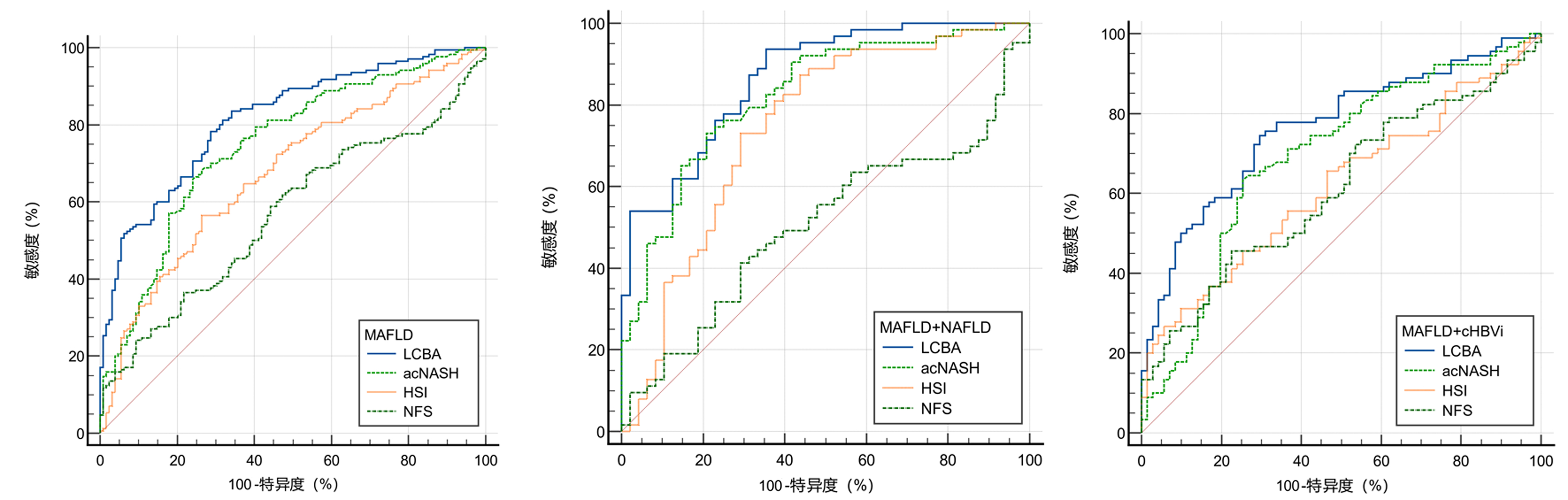 Objective To establish a diagnostic model for steatohepatitis in metabolic associated fatty liver disease (MAFLD) based on LASSO and logistic regression analyses by using general clinical data, serological parameters, and noninvasive liver elastography, and to evaluate the diagnostic value of this model. Methods A total of 299 patients who were diagnosed with MAFLD and underwent liver biopsy in Guangdong Provincial Hospital of Traditional Chinese Medicine from January 2018 to December 2021 were enrolled as subjects, and according to NAS score, they were divided into steatohepatitis group with 170 patients and non-steatohepatitis group with 129 patients. The LASSO regression analysis and the multivariate logistic regression analysis were used to identify the influencing factors for steatohepatitis in MAFLD, and a noninvasive diagnostic model was established, visualized in the form of nomogram, and internally validated by the enhanced Bootstrap method. The receiver operating characteristic (ROC) curve and the calibration curve were plotted for the model, and its diagnostic efficacy was observed in the MAFLD+NAFLD and MAFLD+cHBVi subgroups, which was then compared with other diagnostic models. The chi-square test was used for comparison of categorical data between groups; the independent-samples t test was used for comparison of normally distributed continuous data between groups, and the Mann-Whitney U test was used for comparison of non-normally distributed continuous data between groups. A multivariate logistic regression analysis was used to determine optimal diagnostic factors, and a nomogram diagnostic model was established; the ROC curve was plotted, and the area under the ROC curve (AUC) was calculated; the enhanced Bootstrap method was used for internal validation of the model, and the calibration curve was plotted to show the level of calibration. Results There were significant differences between the two groups in body mass index (BMI), alanine aminotransferase, aspartate aminotransferase (AST), adenosine deaminase, alkaline phosphatase, gamma-glutamyl transpeptidase, total bile acid, total carbon dioxide concentration, uric acid, HbA1c (all P < 0.05). As for FibroScan, there were significant differences between the two groups in liver stiffness measurement (LSM) and controlled attenuation parameter (CAP) (both P < 0.001); as for pathology, there were significant differences between the two groups in fibrosis degree, steatosis score, lobular inflammation score, ballooning degeneration score, and total NAS score (all P < 0.001). In the subgroup analysis, there were 63 patients with steatohepatitis and 48 patients without steatohepatitis in the MAFLD+NAFLD group, and there were 90 patients with steatohepatitis and 71 patients without steatohepatitis in the MAFLD+cHBVi group. The LASSO regression analysis showed that LSM, CAP, BMI, and AST were the best diagnostic factors for the presence or absence of steatohepatitis in MAFLD patients, and the LCBA model was established based on these indices. The LCBA model showed an AUC of 0.816 in the total MAFLD population, 0.866 in the MAFLD+NAFLD population, and 0.764 in the MAFLD+cHBVi population (all P < 0.001), and comparisons based on the ROC curve showed that they were superior to the acNASH, HSI, and NFS models. Conclusion The LCBA model has a stable performance in the diagnosis of steatohepatitis in patients with MAFLD and is superior to acNASH, HSI, and NFS. Therefore, it holds promise for clinical application.