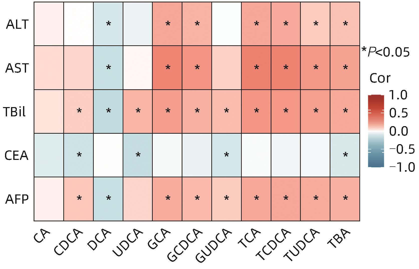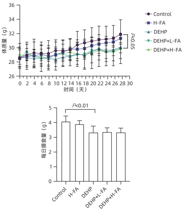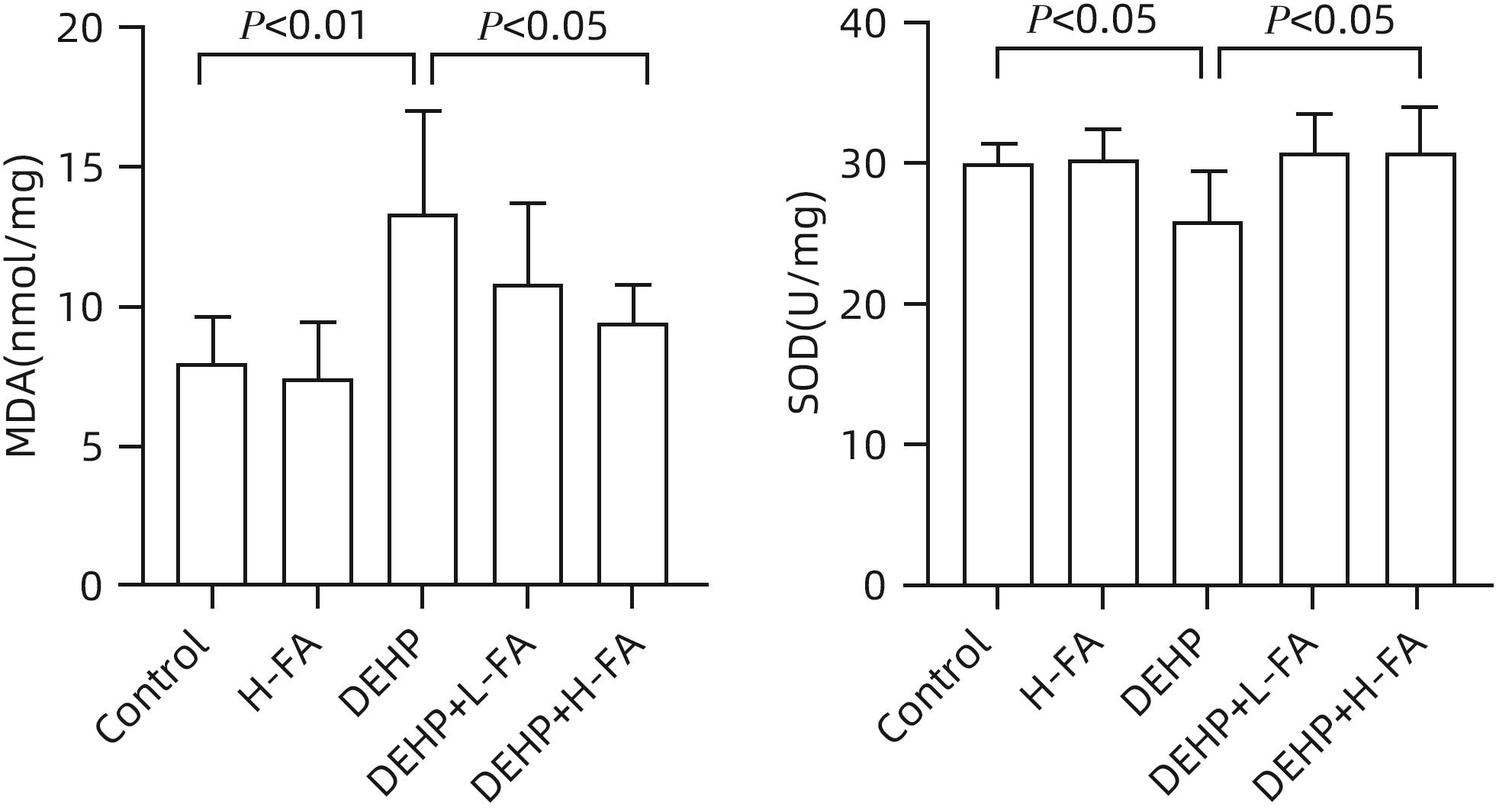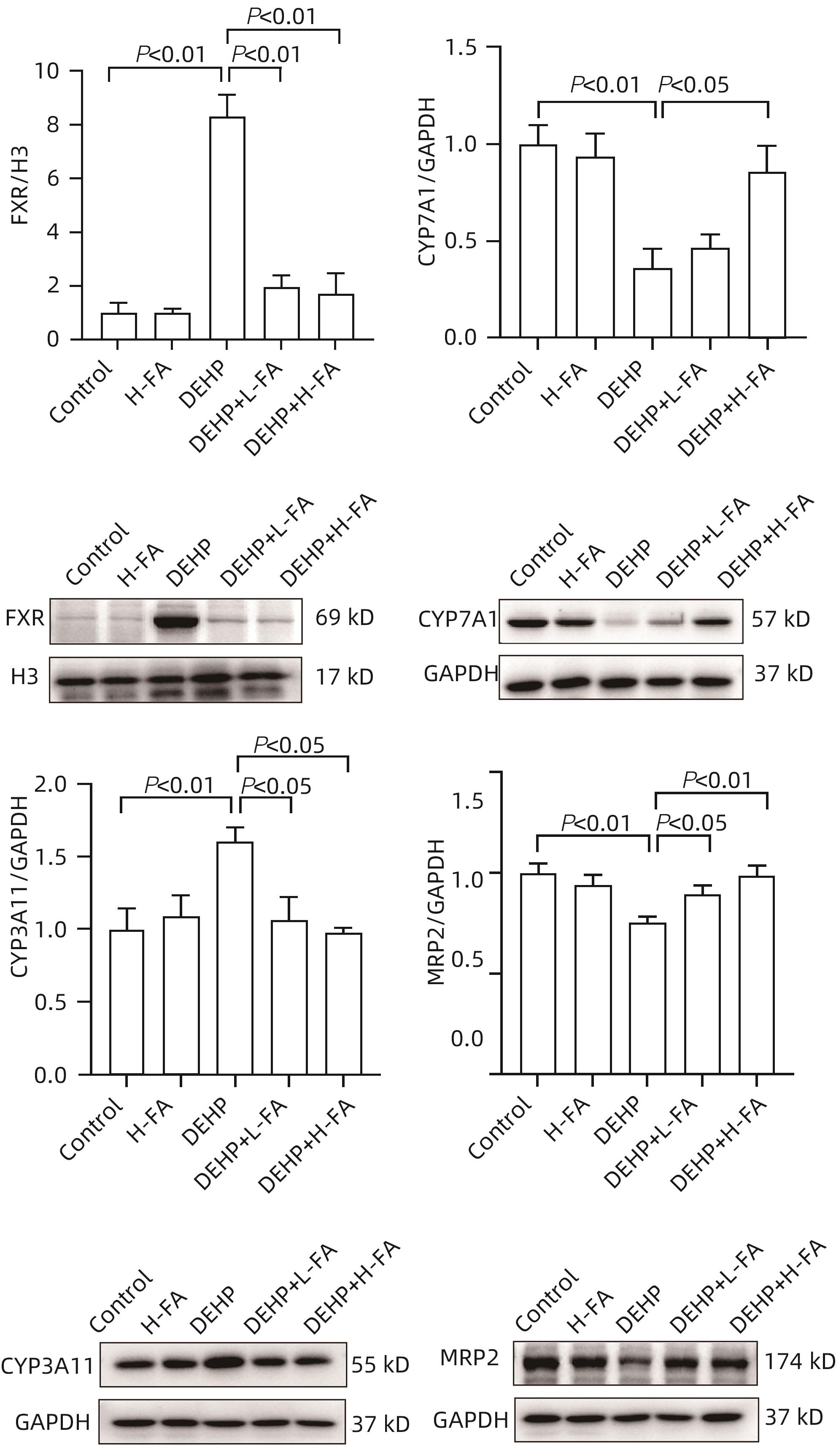 Objective To investigate the protective effect of folic acid against cholestatic liver injury in mice induced by bis(2-ethylhexyl) phthalate (DEHP) exposure and its mechanism. Methods ICR mice were randomly divided into control group, high-dose folic acid (H-FA) group, DEHP group, DEHP+low-dose folic acid (DEHP+L-FA) group, and DEHP+high-dose folic acid (DEHP+H-FA) group, with 6 mice in each group. The mice in the H-FA group, the DEHP+L-FA group, and the DEHP+H-FA group were given folic acid by gavage at the corresponding dose, and those in the control group and the DEHP group were given an equal volume of PBS solution by gavage. After 2 hours, the mice in the DEHP group, the DEHP+L-FA group, and the DEHP+H-FA group were given corn oil containing 200 mg/kg DEHP, and those in the control group and the H-FA group were given an equal volume of pure corn oil, by gavage for 4 weeks. Body weight and food intake were recorded every day, and blood and liver tissue samples were collected. A biochemical analyzer was used to measure the serum levels of total bile acid (TBA) and alkaline phosphatase(ALP); HE staining was used to observe the histopathological changes of liver tissue; kits were used to measure the content of malondialdehyde (MDA) and superoxide dismutase (SOD) in the liver; LC-MS/MS was used to measure serum bile acid profiles; Western blot was used to measure the expression levels of proteins associated with hepatic bile acid metabolism. A one-way analysis of variance was used for comparison of continuous data between multiple groups, and the least significant difference t-test was used for further comparison between two groups. Results Compared with the control group, the daily food intake of the mice in the DEHP group decreased significantly, and the body weight decreased significantly from day 10 (P<0.05), and compared with the DEHP group, the DEHP+L-FA group and the DEHP+H-FA group had basically unchanged body weight and daily food intake (P>0.05). Compared with the control group, the DEHP group had significant increases in liver weight index and the serum levels of TBA and ALP (all P<0.05), with enlarged portal area, bile duct deformity and hyperplasia, and a small amount of inflammatory cell infiltration in liver tissue; compared with the DEHP group, the DEHP+L-FA group and the DEHP+H-FA group had a significant reduction in liver weight index (P<0.01), and the DEHP+H-FA group had significant reductions in the serum levels of TBA and ALP (P<0.05), with a significant improvement in liver histomorphology and structure after folic acid intervention. Compared with the control group, the DEHP group had a significant reduction in the content of SOD (P<0.05) and a significant increase in the content of MDA in the liver (P<0.01), and compared with the DEHP group, the DEHP+H-FA group had significant reductions in the content of MDA and SOD (P<0.05). Compared with the control group, the DEHP group had significant increases in the serum levels of α-muricholic acid (α-MCA),β- muricholic acid (β-MCA),deoxycholic acid (DCA), lithocholic acid (LCA), taurocholic acid (TCA), taurodeoxycholic acid (TDCA), tauroursodeoxycholic acid (TUDCA), tauro-β-muricholic acid (T-β-MCA), tauro-α-muricholic acid (T-α-MCA), taurohyodeoxycholic acid (THDCA), and taurolithocholic acid (TLCA)(P<0.05) and a significant reduction in ursodeoxycholic acid (UDCA)(P<0.05); compared with the DEHP group, the DEHP+H-FA group had significant reductions in the serum levels of DCA, LCA, TCA, TDCA, TUDCA, T-β-MCA, T-α-MCA, THDCA, and TLCA (P<0.05). Compared with the control group, the DEHP group had significant increases in the protein expression levels of FXR and CYP3A11 in the liver (P<0.01) and significant reductions in the protein expression levels of CYP7A1 and MRP2 (P<0.01); compared with the DEHP group, the DEHP+L-FA group and the DEHP+H-FA group had significant reductions in the protein expression levels of FXR and CYP3A11 in the liver (P<0.05) and a significant increase in the protein expression level of MRP2 (P<0.05), and the DEHP+H-FA group had a significant increase in the protein expression level of CYP7A1 (P<0.05). Conclusion Folic acid has a protective effect against cholestatic liver injury in mice induced by DEHP exposure, possibly by regulating bile acid synthesis, catabolism, and transport and maintaining bile acid homeostasis.