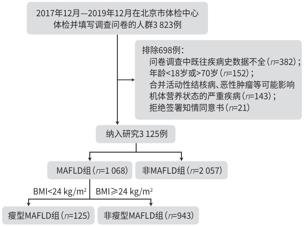 Objective To identify the patients with metabolic dysfunction-associated fatty liver disease (MAFLD) among the health check-up population, and to perform stratified management of patients with the low, medium, and high risk of advanced fibrosis based on noninvasive fibrosis scores. Methods A cross-sectional study was conducted among 3 125 individuals who underwent physical examination in Beijing Physical Examination Center from December 2017 to December 2019, and they were divided into MAFLD group with 1 068 individuals and non-MAFLD group with 2 057 individuals. According to BMI, the MAFLD group was further divided into lean MAFLD group (125 individuals with BMI<24 kg/m2) and non-lean MAFLD group (943 individuals with BMI≥24 kg/m2). Indicators including demographic data, past history, laboratory examination, and liver ultrasound were compared between groups. Fibrosis-4 (FIB-4) score, NAFLD fibrosis score (NFS), aspartate aminotransferase-to-platelet ratio index (APRI), and BARD score were calculated for the patients in the MAFLD group to assess the risk of advanced fibrosis. The independent-samples t test was used for comparison of normally distributed continuous data between two groups, and the Mann-Whitney U rank sum test was used for comparison of non-normally distributed continuous data between two groups; the chi-square test or the Fisher’s exact test was used for comparison of categorical data between groups. A logistic regression analysis was used to investigate the influence of each indicator in MAFLD. Results Compared with the non-MAFLD group, the MAFLD group had significantly higher age (Z=-9.758, P<0.05), proportion of male patients (χ2=137.555, P<0.05), and levels of body weight (Z=-27.987, P<0.05), BMI (Z=-32.714, P<0.05), waist circumference (Z=-31.805, P<0.05), hip circumference (Z=-26.342, P<0.05), waist-hip ratio (Z=-28.554, P<0.05), alanine aminotransferase (ALT) (Z=-25.820, P<0.05), aspartate aminotransferase (AST) (Z=-16.894, P<0.05), gamma-glutamyl transpeptidase (GGT) (Z=-25.069, P<0.05), alkaline phosphatase (Z=-12.533, P<0.05), triglyceride (Z=-27.559), total cholesterol (Z=-7.833, P<0.05), low-density lipoprotein cholesterol (LDL-C) (Z=-8.222, P<0.05), and uric acid (UA) (Z=-20.024, P<0.05), as well as a significantly higher proportion of patients with metabolic syndrome (MetS) (χ2=578.220, P<0.05), significantly higher prevalence rates of hypertension (χ2=241.694, P<0.05), type 2 diabetes (χ2=796.484, P<0.05), and dyslipidemia (χ2=369.843, P<0.05), and a significant reduction in high-density lipoprotein cholesterol (HDL-C) (Z=23.153, P<0.001). The multivariate logistic regression analysis showed that male sex (odds ratio [OR]=1.45, 95% confidence interval [CI]: 1.203 — 1.737), ALT (OR=1.05, 95%CI: 1.046 — 1.062), LDL-C (OR=1.23, 95%CI: 1.102 — 1.373), and comorbidity with MetS (OR=5.97, 95%CI: 4.876 — 7.316) were independently associated with MAFLD. Compared with the non-lean MAFLD group, the lean MAFLD group had significantly higher age (Z=3.736, P<0.05) and HDL-C (Z=2.679, P<0.05) and significant reductions in the proportion of male patients (χ2=28.970, P<0.05), body weight (Z=-14.230, P<0.05), BMI (Z=-18.188, P<0.05), waist circumference (Z=-13.451, P<0.05), hip circumference (Z=-13.317, P<0.05), ALT (Z=-4.519, P<0.05), AST (Z=-2.258, P<0.05), GGT (Z=-4.592, P<0.05), UA (Z=-4.415, P<0.05), the proportion of patients with moderate or severe fatty liver disease or MetS (χ2=42.564, P<0.05), and the prevalence rates of hypertension (χ2=12.057, P<0.05) and type 2 diabetes (χ2=3.174, P<0.05). Among the patients with MAFLD, 10 patients (0.9%) had an FIB-4 score of >2.67, 4 patients (0.4%) had an NFS score of >0.676, 8 patients (0.7%) had an APRI of >1, and 551 patients (51.6%) had a BARD score of ≥2. Conclusion There is a relatively high prevalence rate of MAFLD among the health check-up population in Beijing, but with a relatively low number of patients with a high risk of advanced fibrosis, and such patients need to be referred to specialized hospitals for liver diseases.