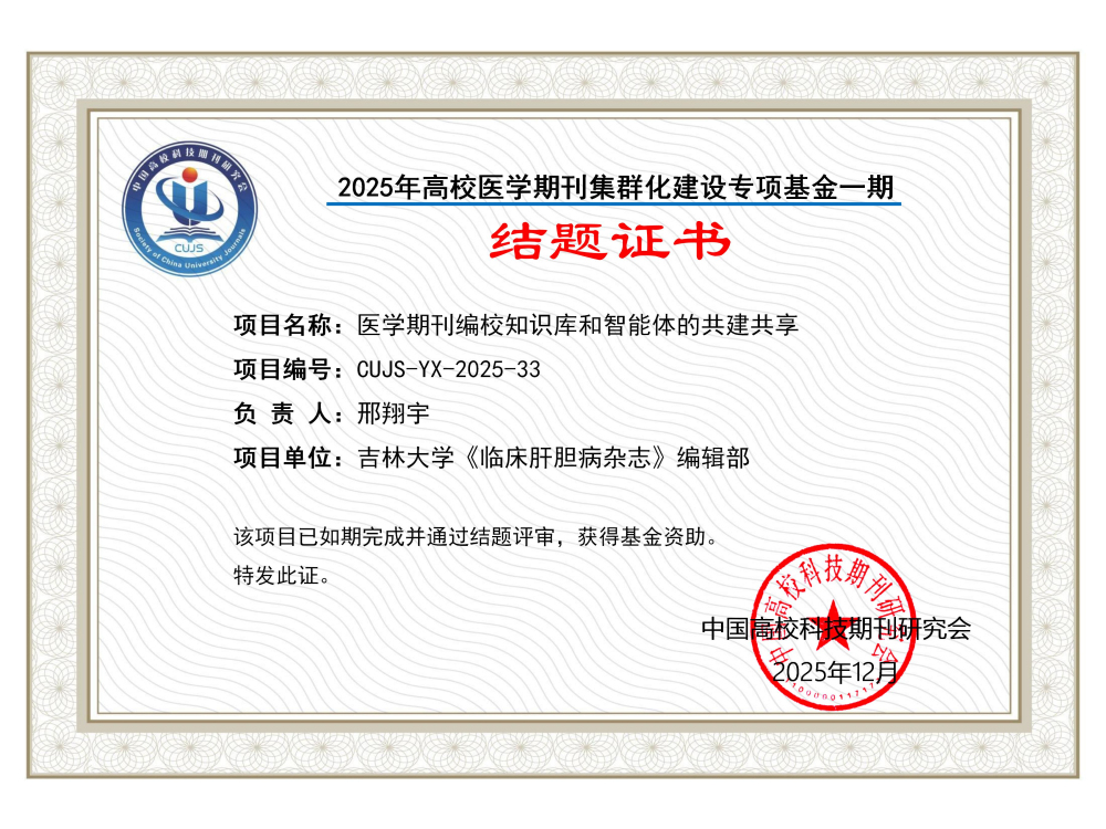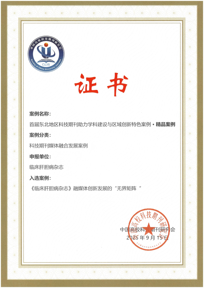 本刊为中国科技期刊卓越行动计划· 中文领军期刊(2024—2028)、中国科技期刊卓越行动计划·中国高校医学集群:创始成员刊(2024—2028)、百种中国杰出学术期刊(2018年、2020年、2021年、2022年)、中国精品科技期刊暨“中国精品科技期刊顶尖学术论文(F5000)”项目来源期刊(2017—2026)、《科技期刊世界影响力指数(WJCI)报告》收录期刊(Q3区)、北大中文核心期刊、中国科技论文统计源期刊(中国科技核心期刊)、RCCSE中国权威学术期刊(A+)。