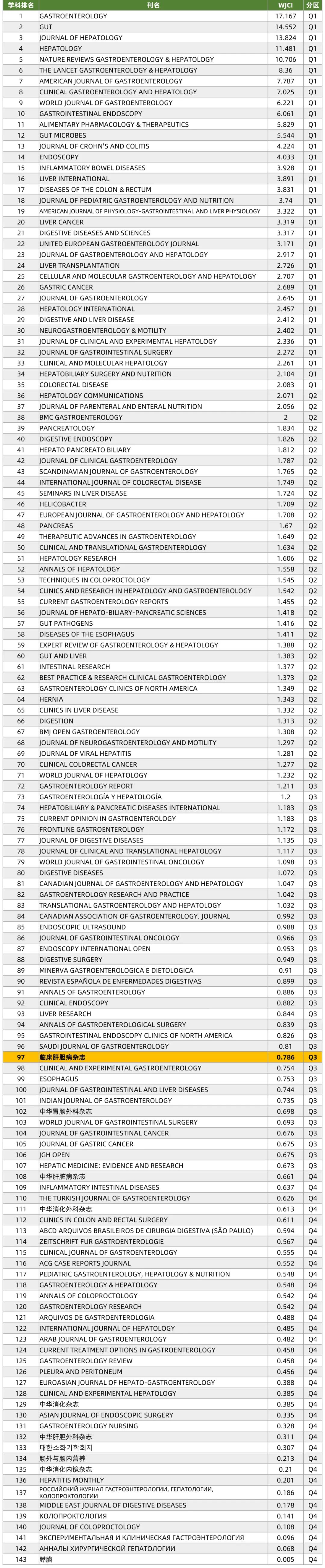 附:WJCI 2023 消化病及腹部疾病学科期刊(143种)排名