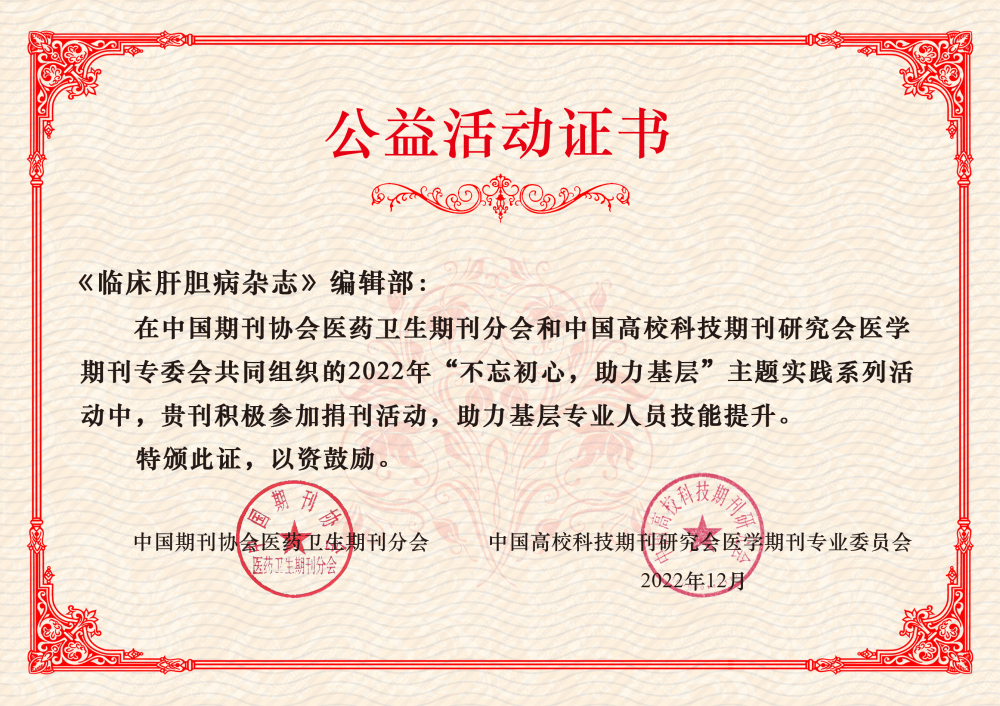2022年8月,中国期刊协会医药卫生期刊分会、中国高校科技期刊研究会医学期刊专委会以中宣部倡导的“三下乡”社会实践系列活动为目标,以“喜迎二十大助力基层行”为主题,共同组织2022年“不忘初心,助力基层”主题实践系列活动。《临床肝胆病杂志》作为中国高校科技期刊研究会医学期刊专业委员会会员单位,积极参与期刊捐赠活动,助力基层专业人员技能提升,获得表彰。