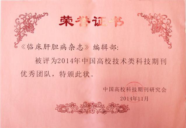 在中国高校科技期刊研究会开展的“2014年中国高校技术类期刊优秀团队·优秀工作者·优秀青年工作者”评选活动中,《临床肝胆病杂志》荣获优秀团队奖。