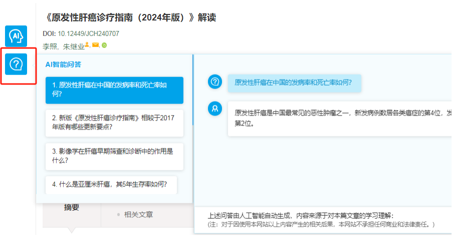 【AI智能化辅读】按钮下方为【AI智能问答】按钮,点击后可见智能问答弹窗。该功能通过大模型自动阅读文章后形成问答对,帮助读者以多样化形式掌握文章脉络和知识要点。