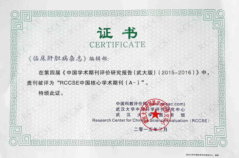由武汉大学中国科学评价中心(RCCSE)、武汉大学图书馆、中国科教评价网等单位主持的《中国学术期刊评价研究报告》(2015-2016)暨第4次中国学术期刊评价工作已正式完成。进入本次评价的6201种学术期刊中共产生了1888种核心期刊,《临床肝胆病杂志》入选“RCCSE中国核心学术期刊(A-)”,在临床医学核心期刊(A-)中排名第2位。