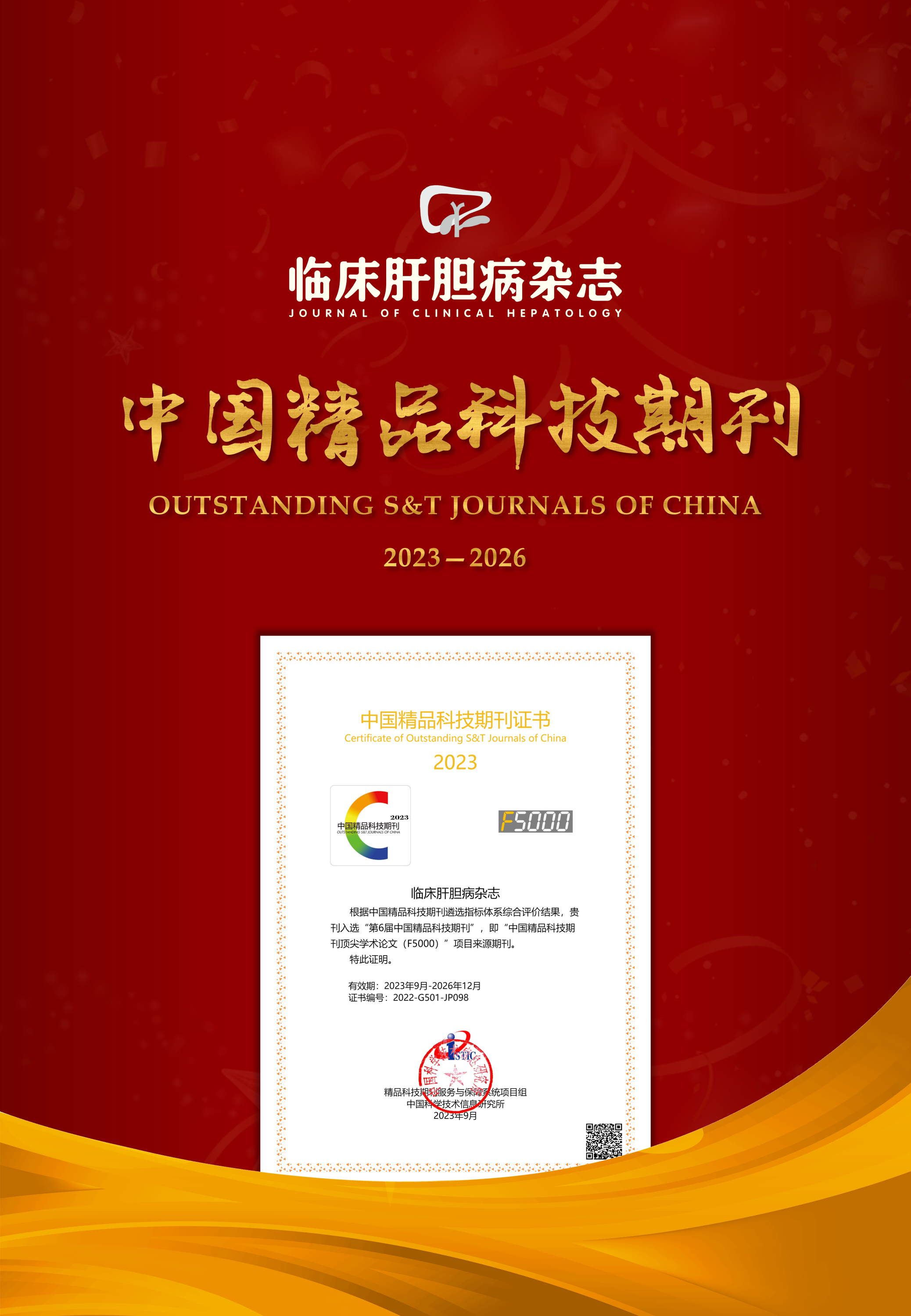 《临床肝胆病杂志》入选“第6届中国精品科技期刊(2023—2026)”,连续三届获此殊荣