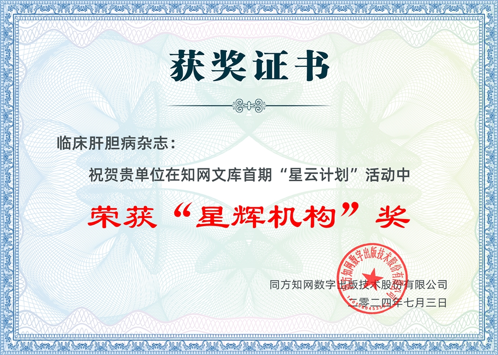 2024年7月30日,知网文库首期「星云计划」获奖名单揭晓,《临床肝胆病杂志》获评“星辉机构”奖。本次活动自2024年1月20日启动,吸引了来自高校、中小学、科研院所、学会协会、政府机关、企业、刊社、医院、律所等机构的5000余名个人创作者与近百家机构踊跃参与,本次评选共计100位个人创作者荣获“星耀作者”奖,10家机构荣获“星辉机构”奖。