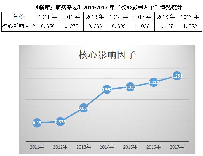 据中国科学技术信息研究所最新统计分析结果显示:《临床肝胆病杂志》在2017年《中国科技期刊引证报告(核心版)》中的影响因子为1.253,比2016年的1.127提升了11.2%,在16种消化病学类核心期刊中,影响因子和综合评价总分均上升至第二位。近年来,本刊的影响因子呈现出不断上升的趋势。