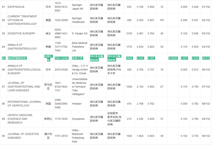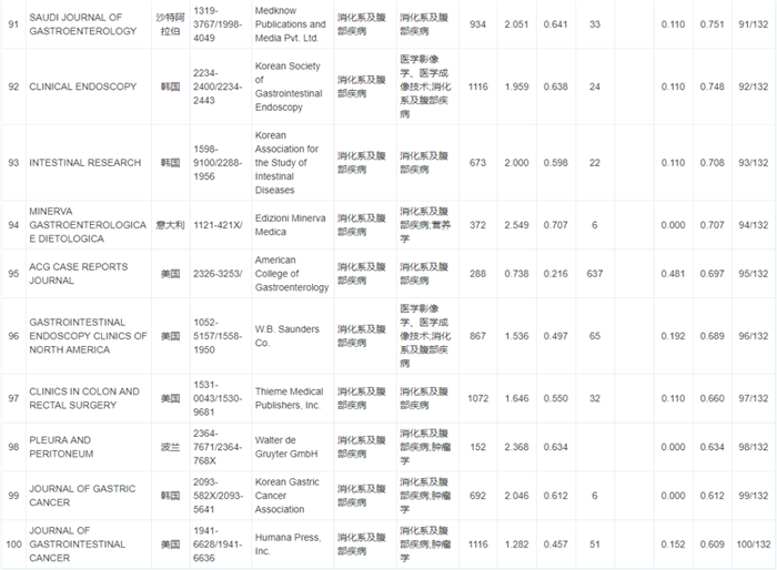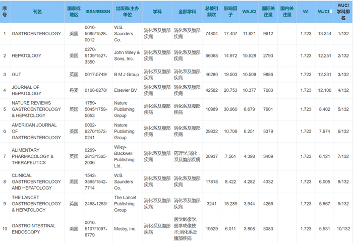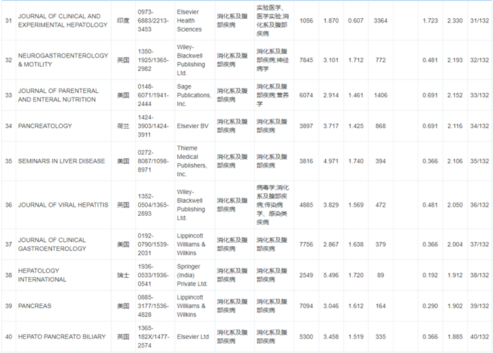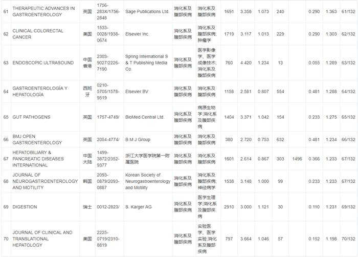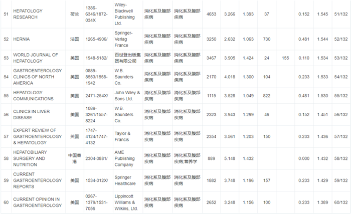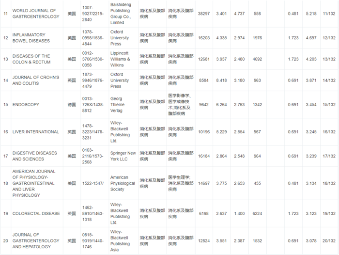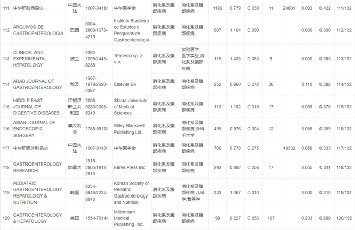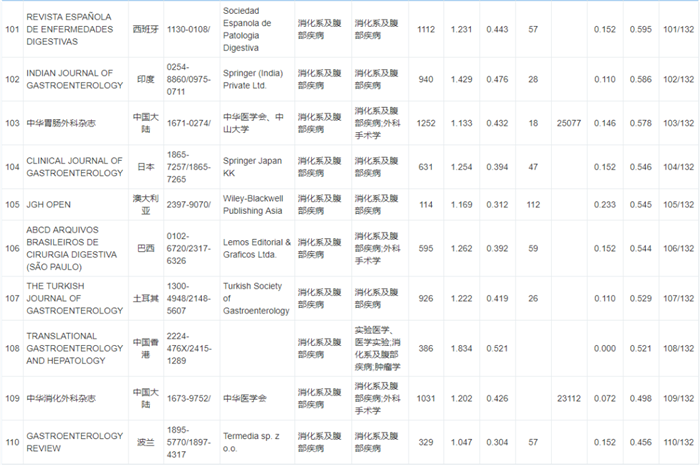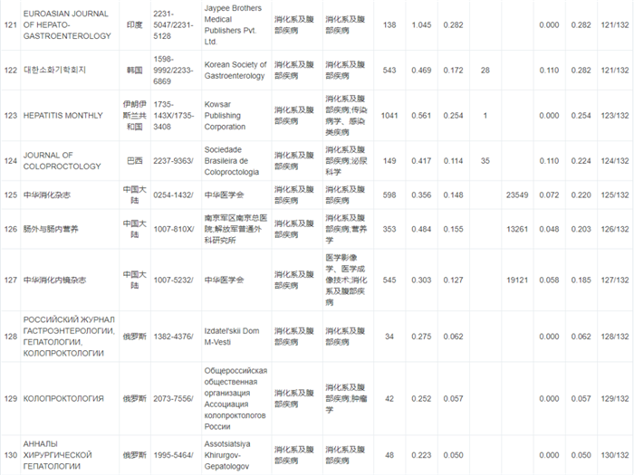 《WJCI 2020“消化病及腹部疾病”学科期刊名录》132种期刊排名如下: